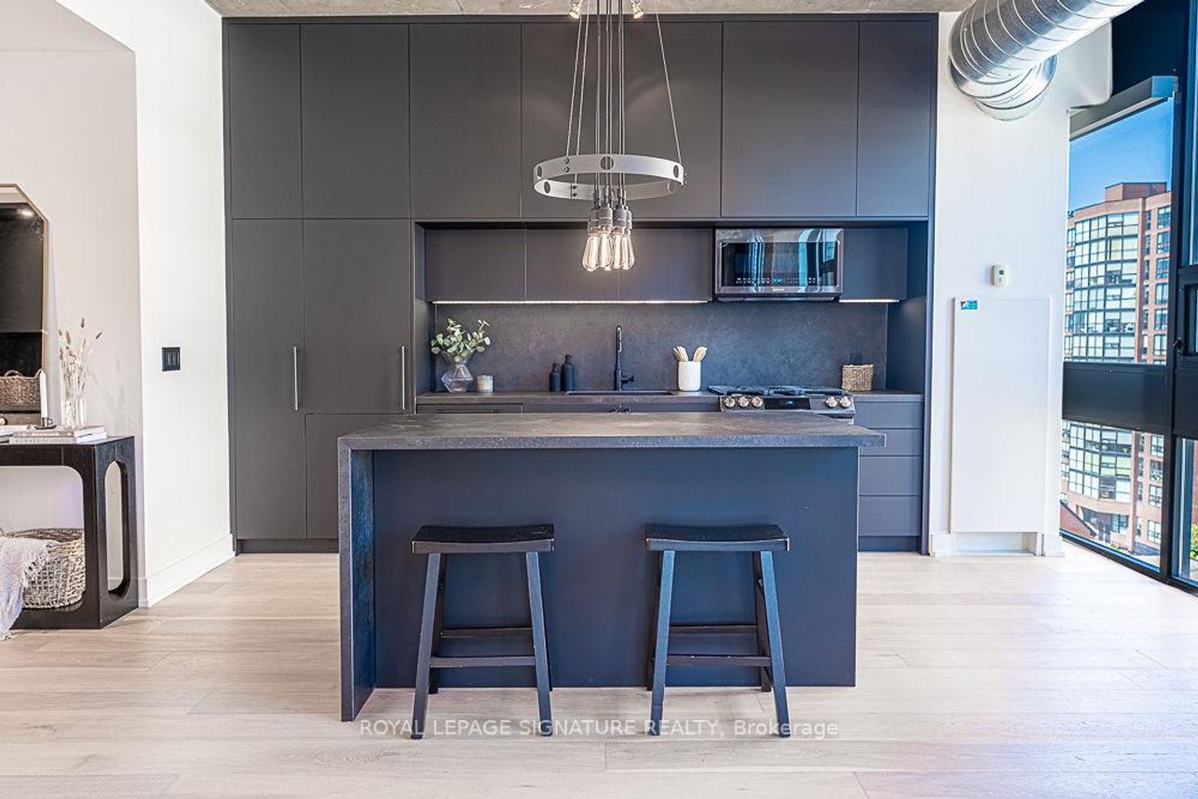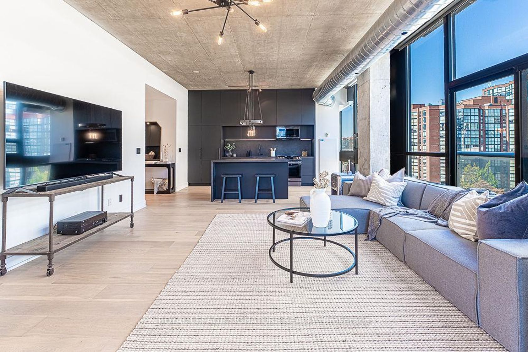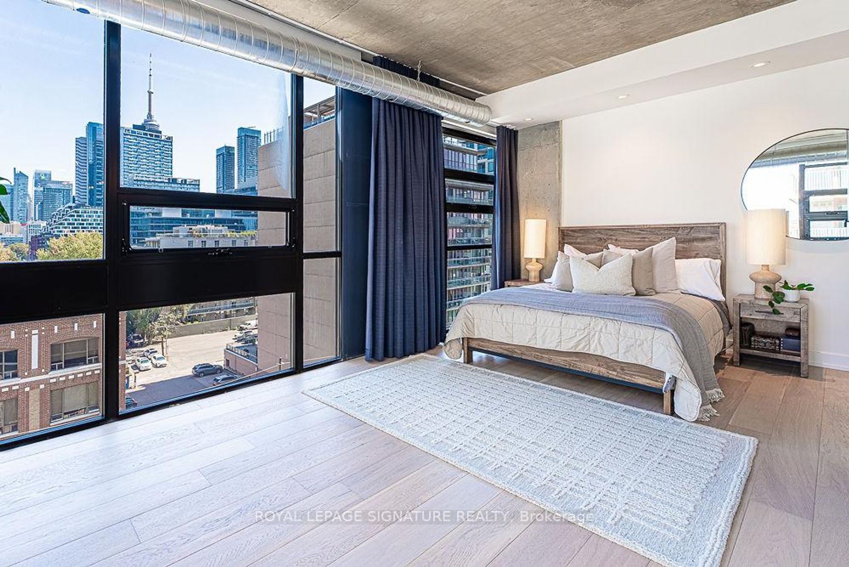 Welcome to a rare urban masterpiece in the heart of King West. This fully renovated loft-style condo offers 1,081 square feet of designer living space with every detail carefully curated for those who demand the finest. Step inside to soaring exposed concrete ceilings, sleek white oak flooring, and floor-to-ceiling windows that flood the home with natural light while framing iconic views of the CN Tower. Automated Hunter Douglas blinds and high-end blackout curtains covering every window (combined value of $40k) add both convenience and sophistication. The open-concept layout is anchored by custom cabinetry and luxury finishes throughout, creating a space that is as functional as it is striking. A Juliette balcony brings in fresh air, while the crown jewel of this property awaits above-a stunning rooftop patio with wraparound views of Toronto's skyline, the perfect backdrop for entertaining or quiet evenings under the stars. Low maintenance fees, boutique living, and a prime location at King & Bathurst put you steps from Toronto's best dining, nightlife, and cultural experiences. This is more than a condo-it's a statement of style, comfort, and city living at its best.