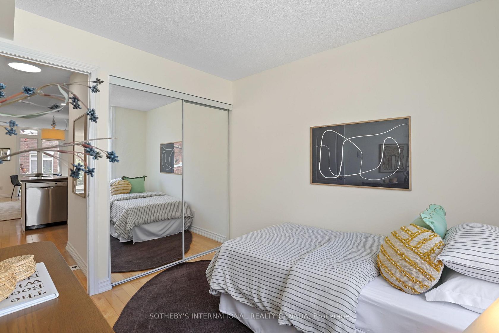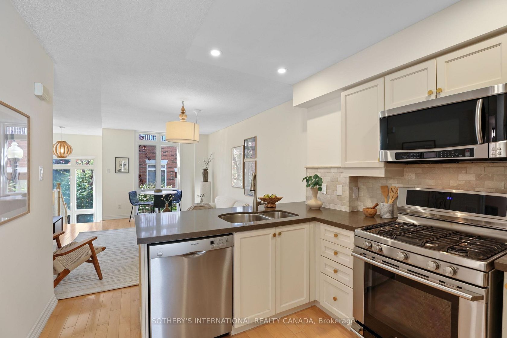 Welcome to suite 1204, a rare two-storey townhome that combines the sophistication of a New York style walk-up with the comfort and convenience of modern King West living. Offering 1,050 square feet of living space, this 2 bed, 2-bath home delivers both functionality and timeless design.The west-facing family room is a showstopper, bathed in natural light through dramatic floor-to-ceiling windows. This airy, sun-drenched space creates an inviting backdrop for both casual evenings and elegant entertaining. The adjoining private eat-in kitchen is beautifully updated, featuring stainless steel appliances, quartz countertops, custom cabinetry, and a chic subway tile backsplash striking the perfect balance between style and durability. Two spacious bedrooms upstairs offer flexibility for a guest room, nursery, or home office, while an updated main-floor 4-piece bathroom adds a touch of spa-like refinement. The finished lower level extends the living space with endless possibilities - a media room, office, or additional bedroom - with direct access to the highly desired private garage. Refined upgrades including laminate floors, fresh paint throughout, and carefully curated finishes elevate the homes contemporary aesthetic. A private front courtyard enhances the sense of arrival, providing a quiet outdoor retreat in the heart of the city. Set within vibrant King West Village, you are steps from Queen West, Liberty Village, the city's trendiest restaurants, and boutique shops, with convenient access to TTC, light rail, and major highways.