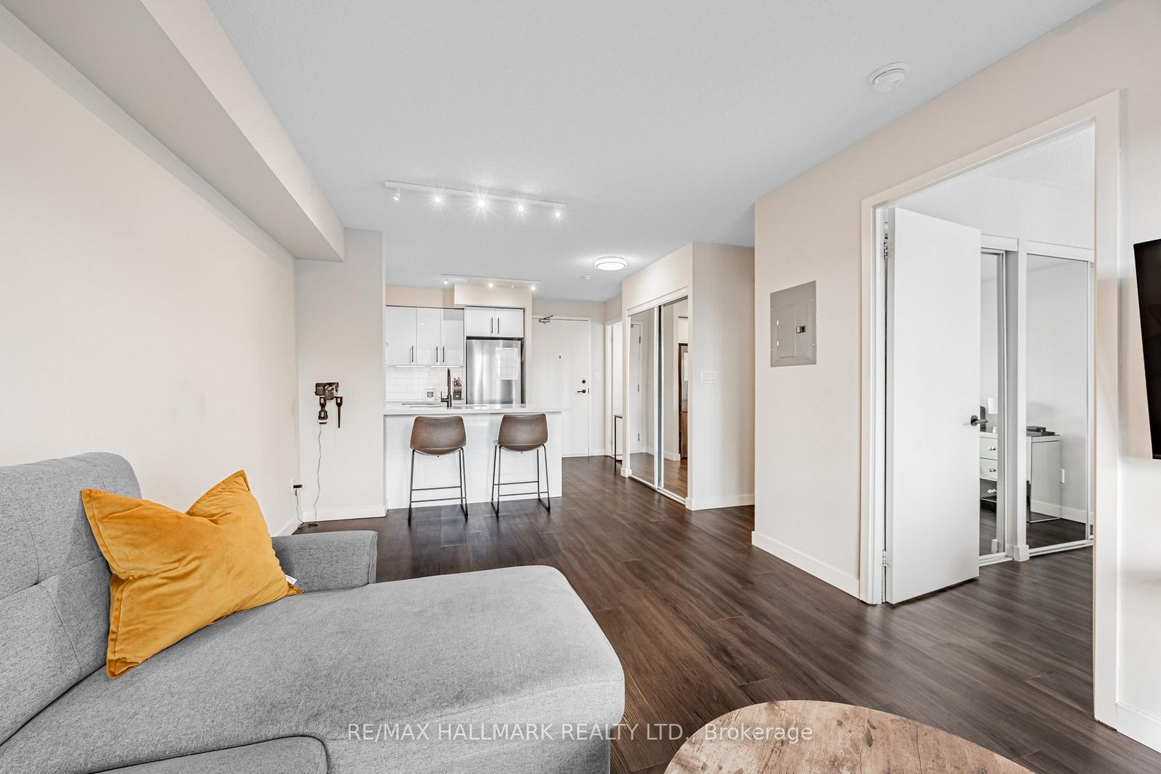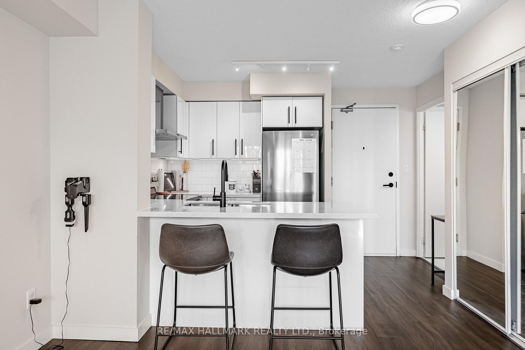 Welcome to 120 Dallimore Circle! This beautifully renovated 1-bedroom plus enclosed den offers the versatility of a two-bedroom layout. The den is fully enclosed with a door, perfect as a guest room or private office, featuring inside lighting not typical in dens. Upgrades include added lighting, black accent faucets and fixtures, a floating vanity, a custom glass bathtub, refreshed kitchen finishes with a stylish breakfast bar, and upgraded indoor blinds. The open balcony provides a peaceful green view of lush trees, while the bedroom and living room overlook serene surroundings. Enjoy building amenities including an indoor pool, sauna, fitness centre with recently updated equipment, party room, media room, and billiards room. Ideally located just minutes from Eglinton LRT, TTC bus stops, Don Mills shopping hub, schools, major highways, and walking trails. Move-in ready with style and functionality!