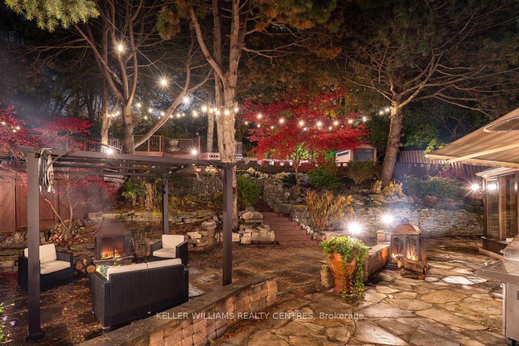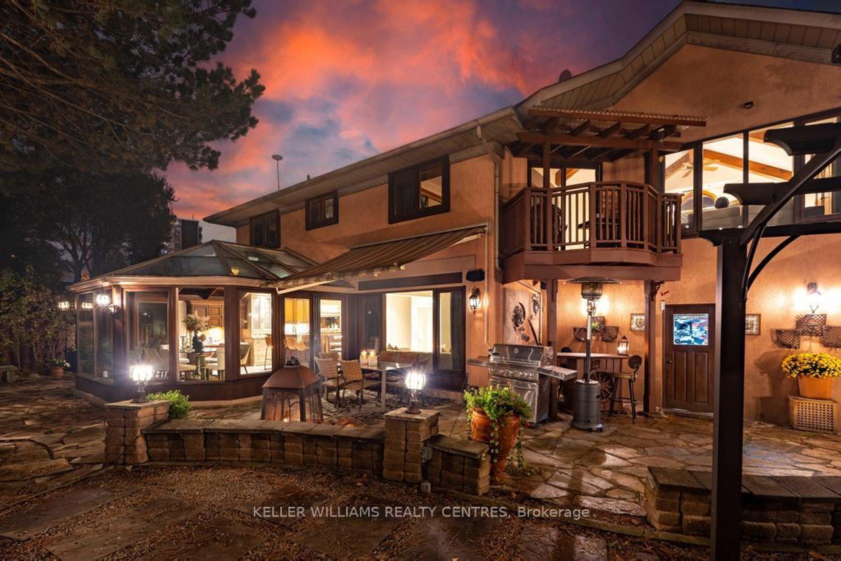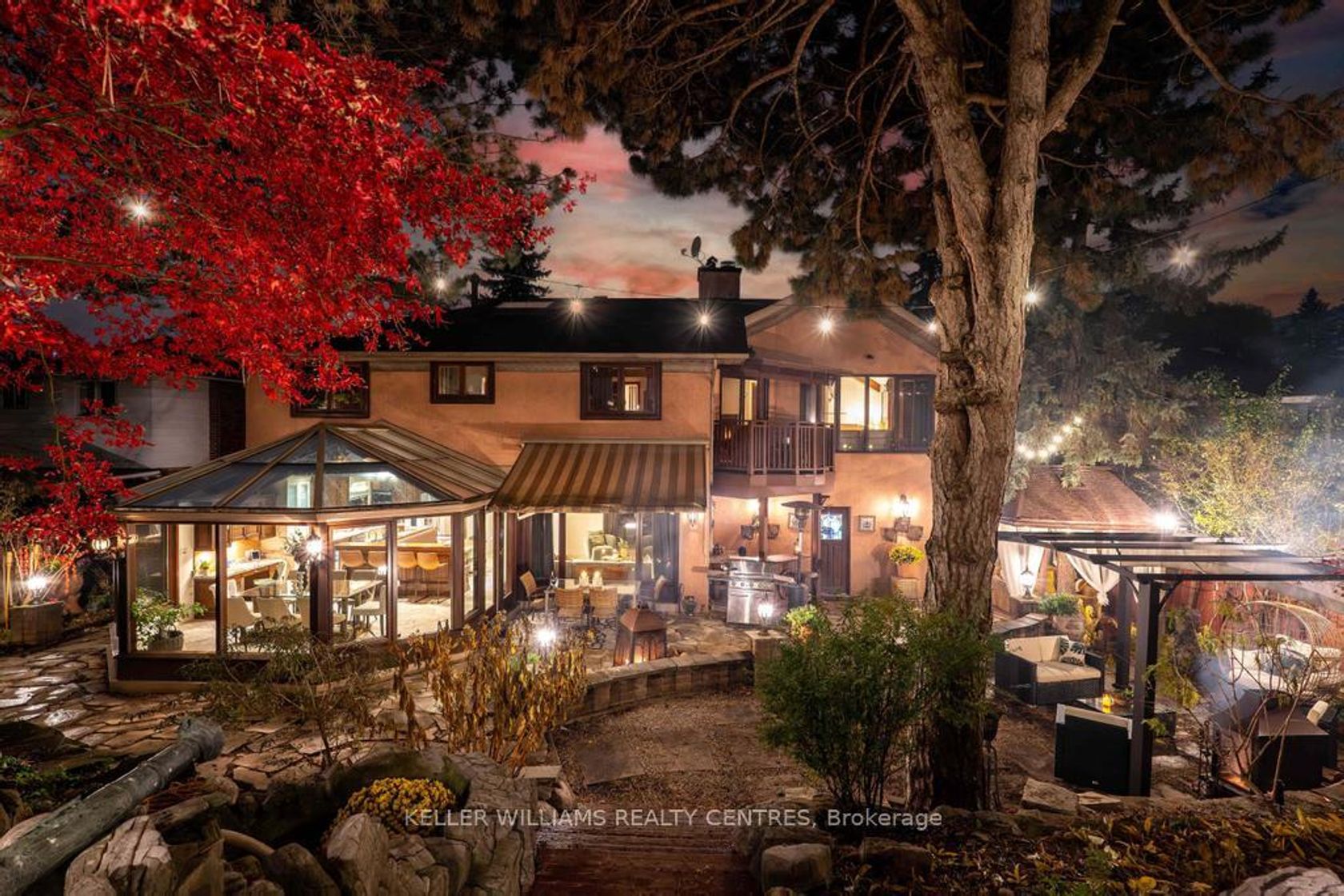 Step into your private urban oasis with this exceptional home, featuring 3 spacious bedrooms and a versatile 4th den on the 2nd floor, perfect as a nursery, office, or cozy retreat. The primary suite impresses with vaulted ceilings, a custom wood-burning fireplace, a private balcony, and a spa-inspired ensuite complete with a built-in sauna and a glass-enclosed oversized shower. Natural light floods the upper hallway through a skylight, creating a warm and inviting atmosphere. At the heart of the home, the chef's kitchen is designed for both family living and entertaining, with built-in appliances, generous stone surfaces, a prep sink, a built-in breakfast nook, and integrated indoor Sonos speakers with dedicated wall controls. Sunlight fills the adjacent dining room and sunroom, offering year-round views of the lush, meticulously curated gardens. Additional highlights include a private main floor office with its own wood-burning fireplace, a functional mudroom with built-in bench, a walk-in closet, abundant storage throughout, and a fully equipped lower-level in-law or nanny suite with its own kitchen, fireplace, living space, and 5th bedroom. Three wood-burning fireplaces throughout the home add warmth and charm to every room. The resort-style backyard is a true entertainer's dream, featuring a heated pool, cabana, two fire pits, an outdoor speaker, a Natural Gas BBQ, multiple seating and dining areas, and beautifully landscaped gardens that ensure privacy and serenity. Set on a rare pie-shaped lot spanning almost 1/3 acre, over 200 feet deep and opening to a 121 ft rear lot line, this property perfectly balances the tranquility of a private retreat with the convenience of city living, just moments from highways, Fairview Mall, the subway, parks, and top-rated schools. An extraordinary offering not to be missed, schedule your private tour today.