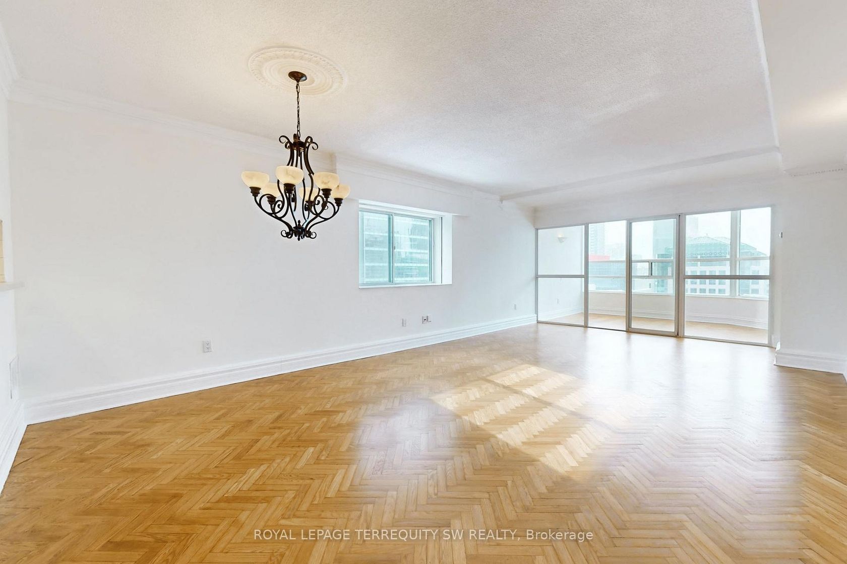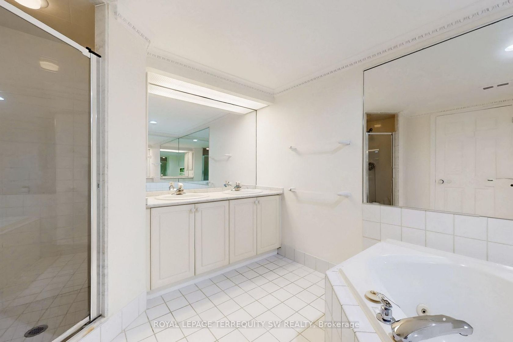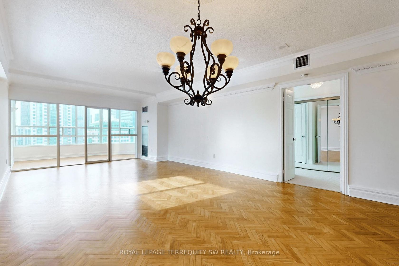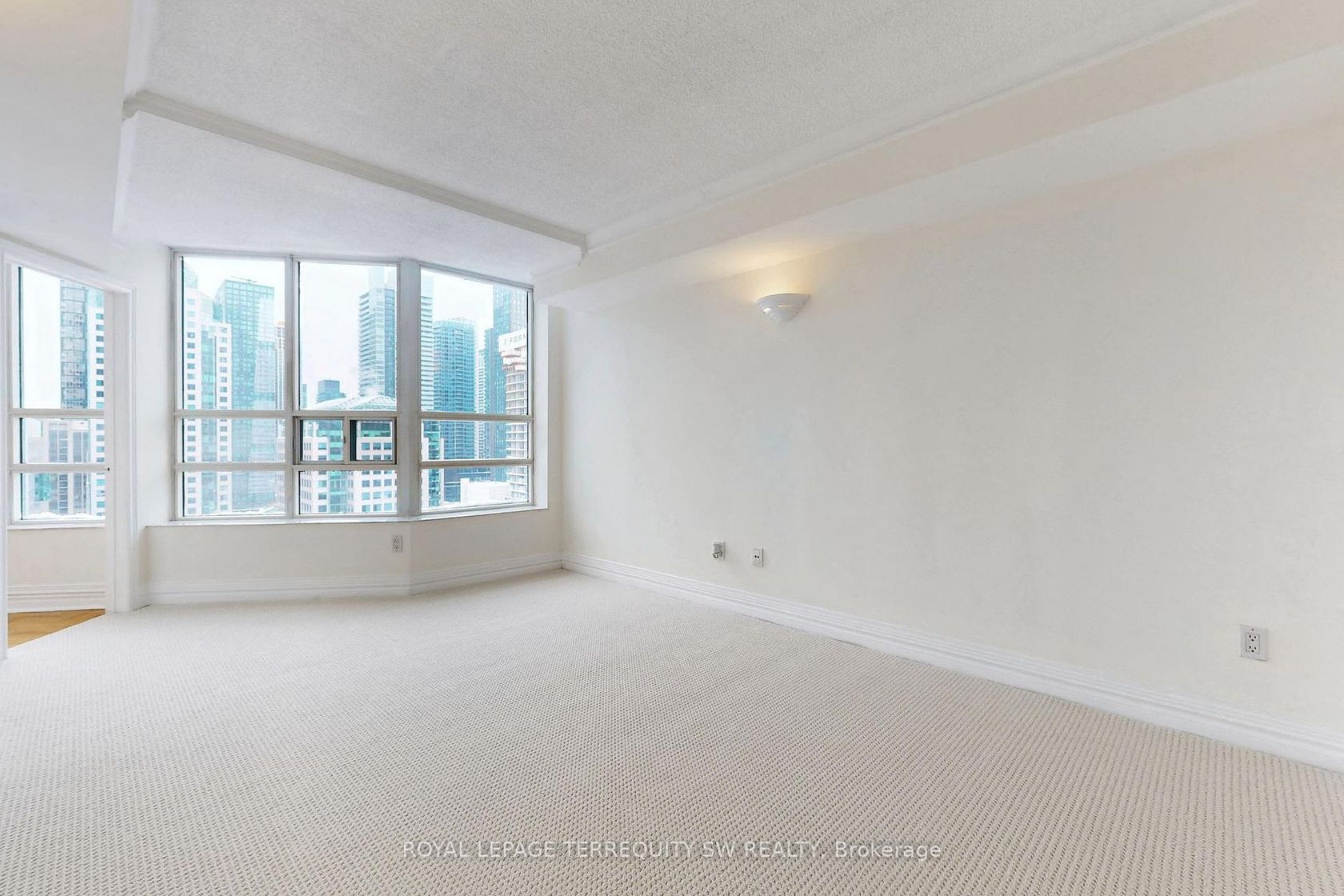 Welcome to Symphony Place! One Toronto's premier luxury residences! This Elegant South and West-Facing corner suite offers Iconic City Views overlooking Toronto's posh Entertainment District. This spacious 1230 sq ft residence is presently demised with a sumptuous Primary bedroom retreat, and a sundrenched solarium residence. Bathed in natural light from its west exposure, this refined suite offers open city vistas and direct views overlooking Roy Thomson Hall creating a dramatic and urban backdrop. The Living room, Dining room, and glass-enclosed solarium are seamlessly connected and finished with herringbone hardwood floors, high baseboards, and elegant cornice moulding, offering both warmth and architectural character. The solarium - accessible through sliding glass doors from the living room and a separate door from the primary bedroom - is an ideal space for a home office, reading lounge, or formal sitting area. The self-contained kitchen features a passthrough to the dining area, allowing for effortless entertaining, while a windowed dining room is highlighted by a ceiling medallion and decorative light fixture, adding classic charm. A Stacked washer and dryer are conveniently located just off the kitchen. The primary bedroom is a serene retreat featuring plush new broadloom with a walk-in closet, and offers direct access to a spacious 5-piece ensuite complete with a jacuzzi tub and separate shower stall and twinned vanity. A thoughtfully placed 3-piece guest washroom is finished with crown moulding, adds comfort, privacy and functionality. This bright and gracious suite blends timeless detailing with generous amounts flexible living space-perfect for buyers seeking elegance, light, and a premier downtown address with cultural landmarks right outside their window. Beyond the building, you are steps to the Theatre Disctrict, fine dining, Street Car and Subway access, plus access to both the P-A-T-H and shopping. Enjoy all of the best that Toronto has to offer!