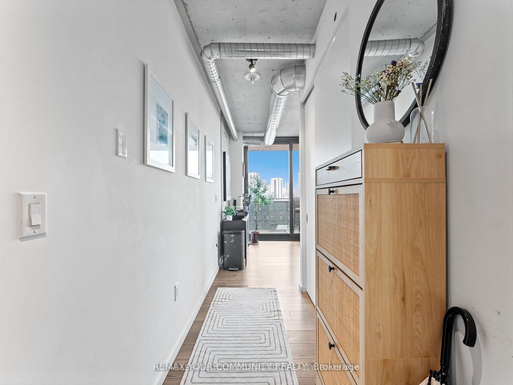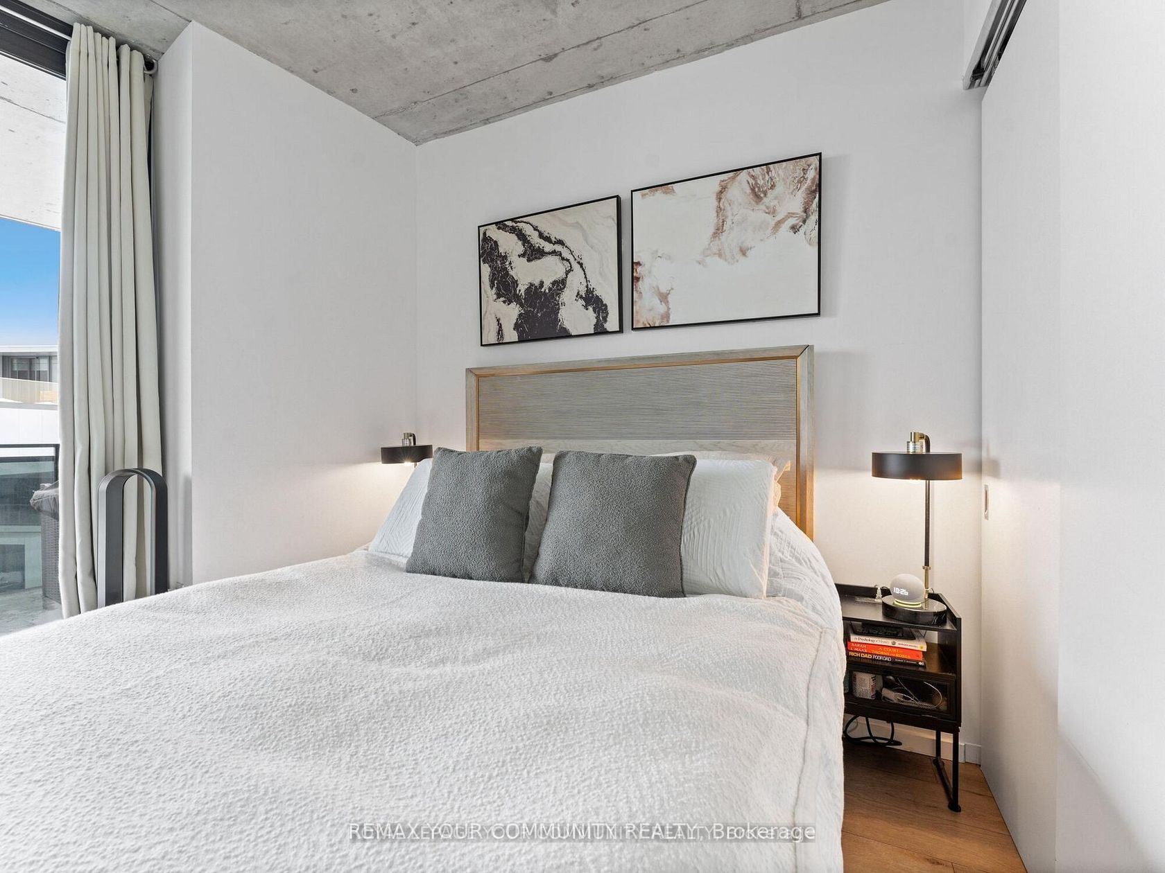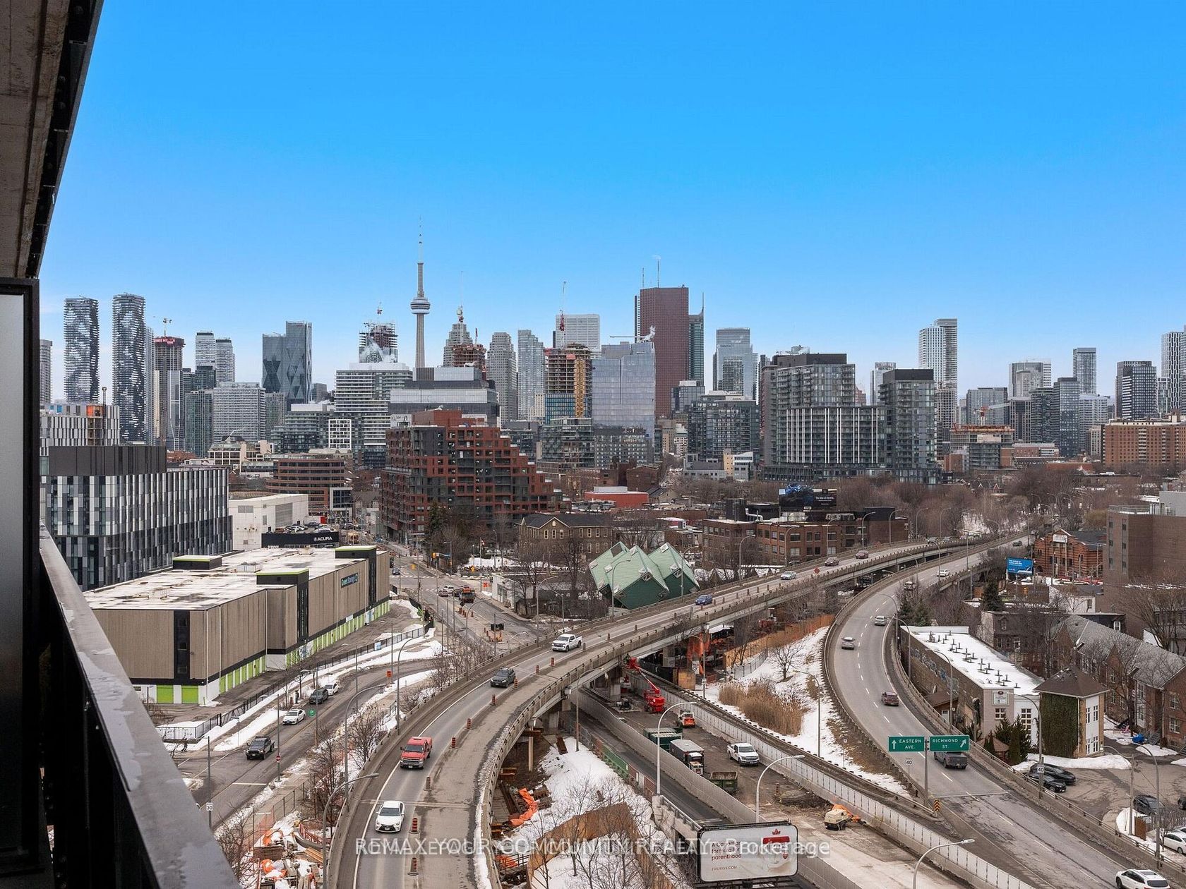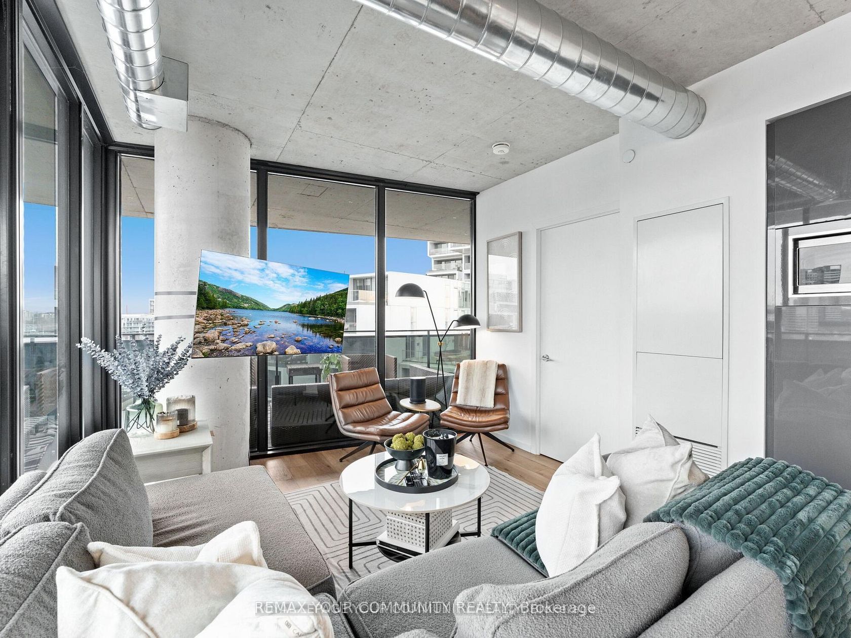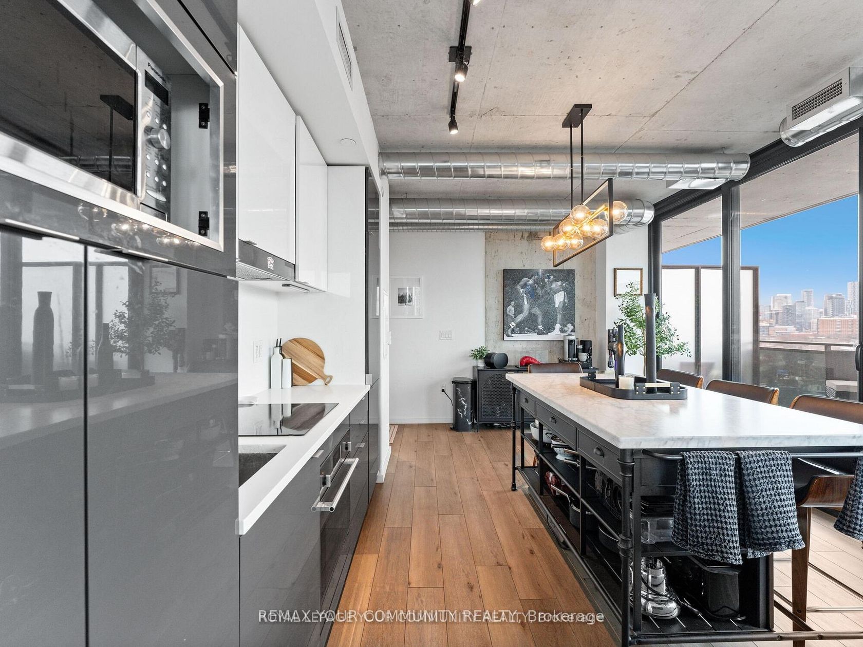 Welcome to Harris Square - a modern boutique loft-style corner unit boasting 608 sqft of contemporary living space plus an expansive 478 sqft terrace with breathtaking, unobstructed views of downtown. Conveniently located just steps from Leslieville, the Distillery District, St. Lawrence Market, and the Financial District. This modern loft features soaring 9-ft exposed concrete ceilings, stunning hardwood floors throughout, a sleek kitchen, and a spa-inspired bathroom. The loft is surrounded by floor to ceiling windows so you have a stunning view from every corner of the apartment. The most unique feature of this condo is the luxurious wraparound balcony with NE city views and a gas line for a barbecue perfect for hosting. Building amenities include an executive concierge, a fully-equipped gym, a serene yoga space, guest suite, party room, and a rooftop terrace with panoramic views. Additional perks include a kids' playroom, a library, and more. The unit comes complete with stainless steel appliances (fridge, stove, built-in dishwasher, and all-in-one washer/dryer), as well as a dedicated parking spot and locker.
