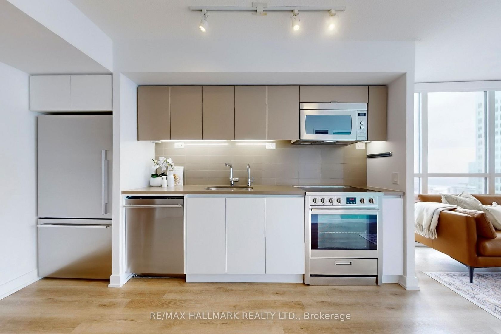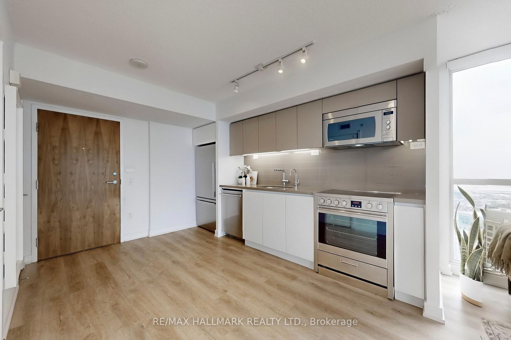 One of Toronto's best views with truly unforgettable sunsets. This upgraded 1 bed 1 bath private corner suite is all about light, style, and panoramic Lake Ontario views. With south and west facing floor-to-ceiling windows, the space is drenched with natural light and framed by epic city and water views. 673 sq ft including large balcony that extends your living outdoors, perfect for watching the boats float by. Move-in ready with upgraded wide plank hardwood floors throughout. Kitchen is sleek with stainless steel appliances, tile backsplash, and bonus reverse osmosis water system for pure hydration. Oversized bedroom can easily accommodate a home office setup and includes a custom closet organizational system. Dual bathroom access from bedroom + living and updated with a modern glass enclosure and ensuite laundry (never been used washer & dryer). Extras include parking (close to the elevator), locker and smart Ecobee thermostat. Enjoy being steps from restaurants, parks and scenic waterfront trails. Walk to Loblaws, Farm Boy, LCBO, The Well and countless shopping and dining options. Top tier building amenities: fitness center, indoor pool, hot tub, sauna, BBQ rooftop terrace, and 24/7 concierge. Easy access to the TTC, Gardiner, 5 mins to Rogers Centre. Bright, upgraded, modern - with a view you'll love.