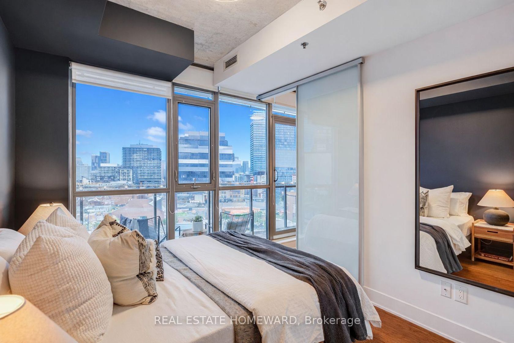 TRINITY LOFTS IN CORKTOWN / Rarely available, sun-filled suite with a highly functional open-concept layout in one of Corktown's most sought-after boutique loft buildings. Features include outfitted wardrobe closets (included), engineered hardwood floors, and 9-ft exposed concrete ceilings for a true loft feel. Spacious bedrooms with sliding glass doors and wall-to-wall west facing windows with roller blinds throughout. The stylish kitchen is equipped with tall cabinetry, quartz countertops, gas range, and stainless steel appliances. Step out to a generously sized balcony with gas line for BBQs and enjoy spectacular, unobstructed skyline and sunset views... Made for easy everyday living with ensuite laundry, Alfred dry-cleaner delivery lockers, and package/parcel delivery directly to your suite. [1 parking space P2#16 owned included + second spot and locker can be rented] Building amenities include a gym, party room, and rooftop terrace. **** Live your best life in the heart of Corktown - walk to brunch spots, cafes, shops, parks, the Distillery District, Corktown Common, St. Lawrence Market, and Cooper Koo YMCA. A commuter's dream with transit at your doorstep and the future Ontario Line station steps away. Quiet, safe pocket next to 51 Division, surrounded by bike trails and offering easy access to all major routes...You'll love living here!
