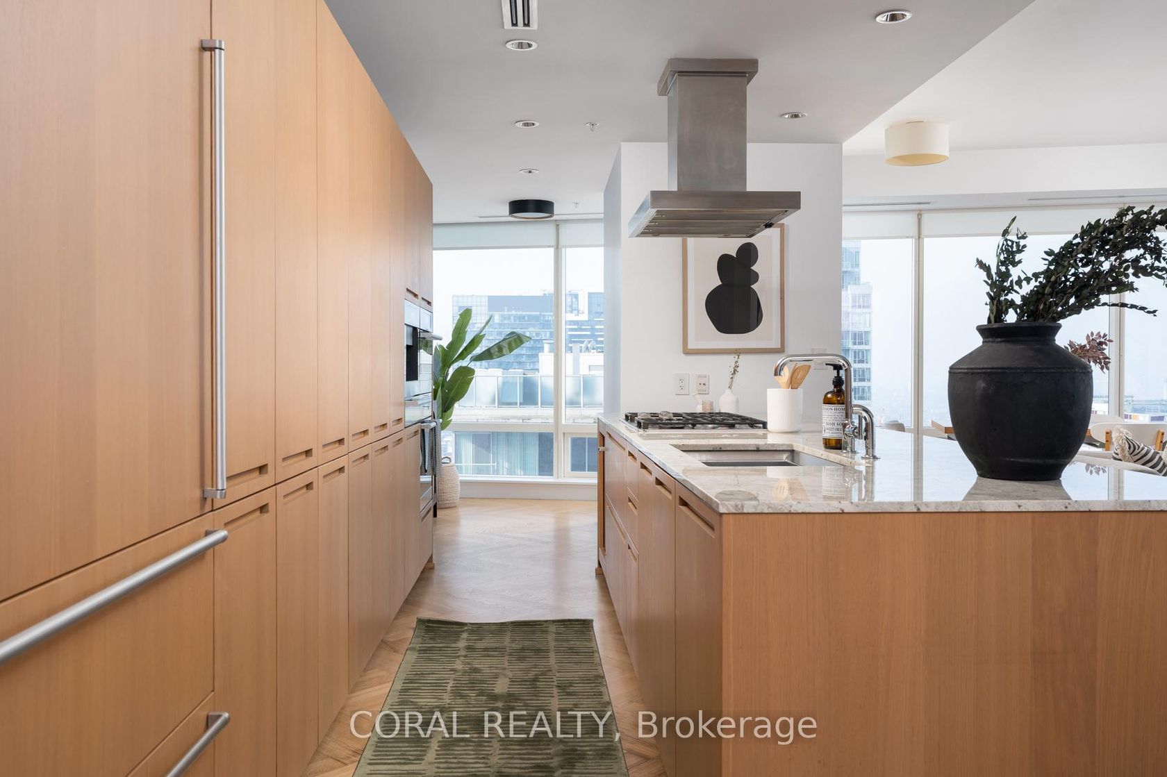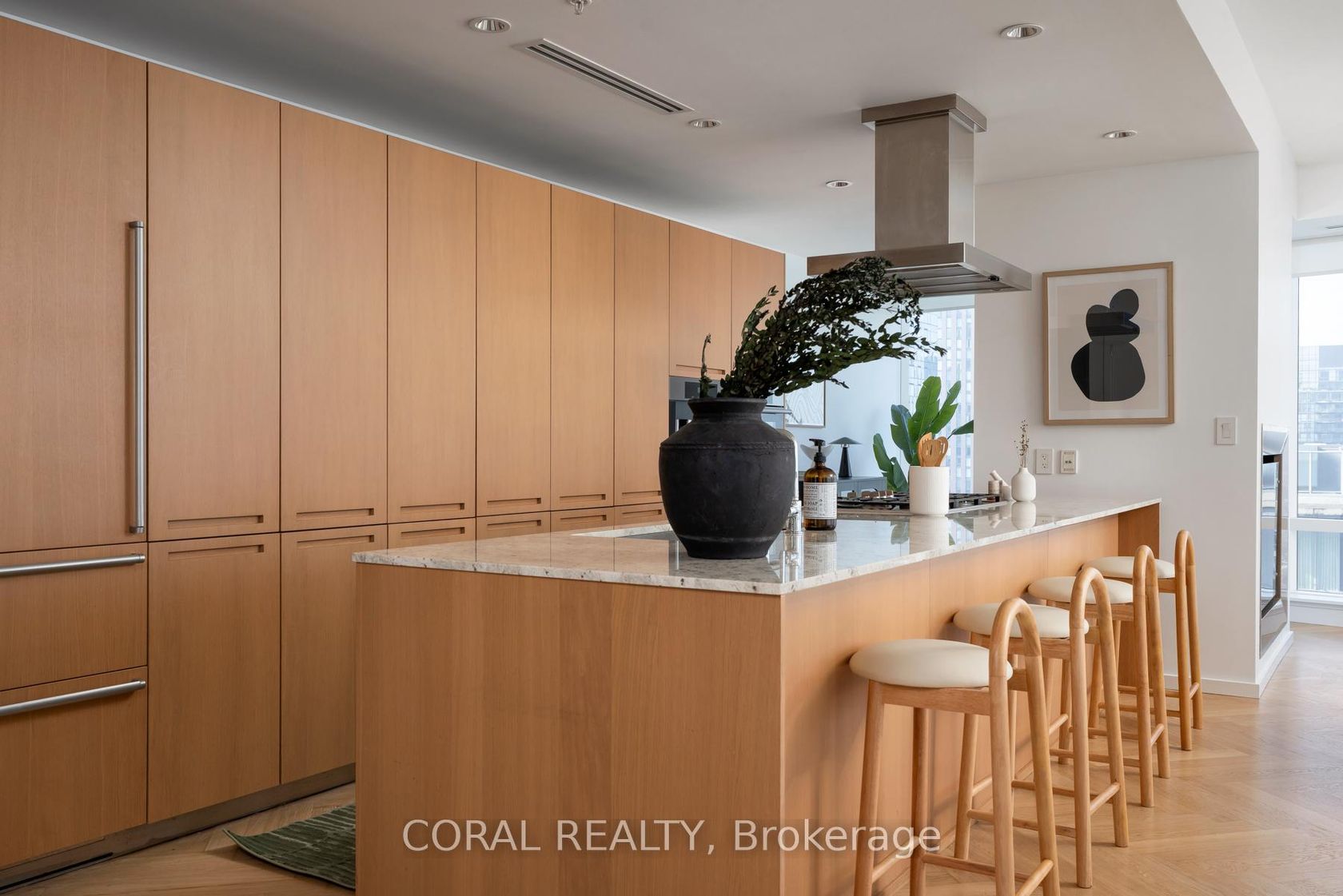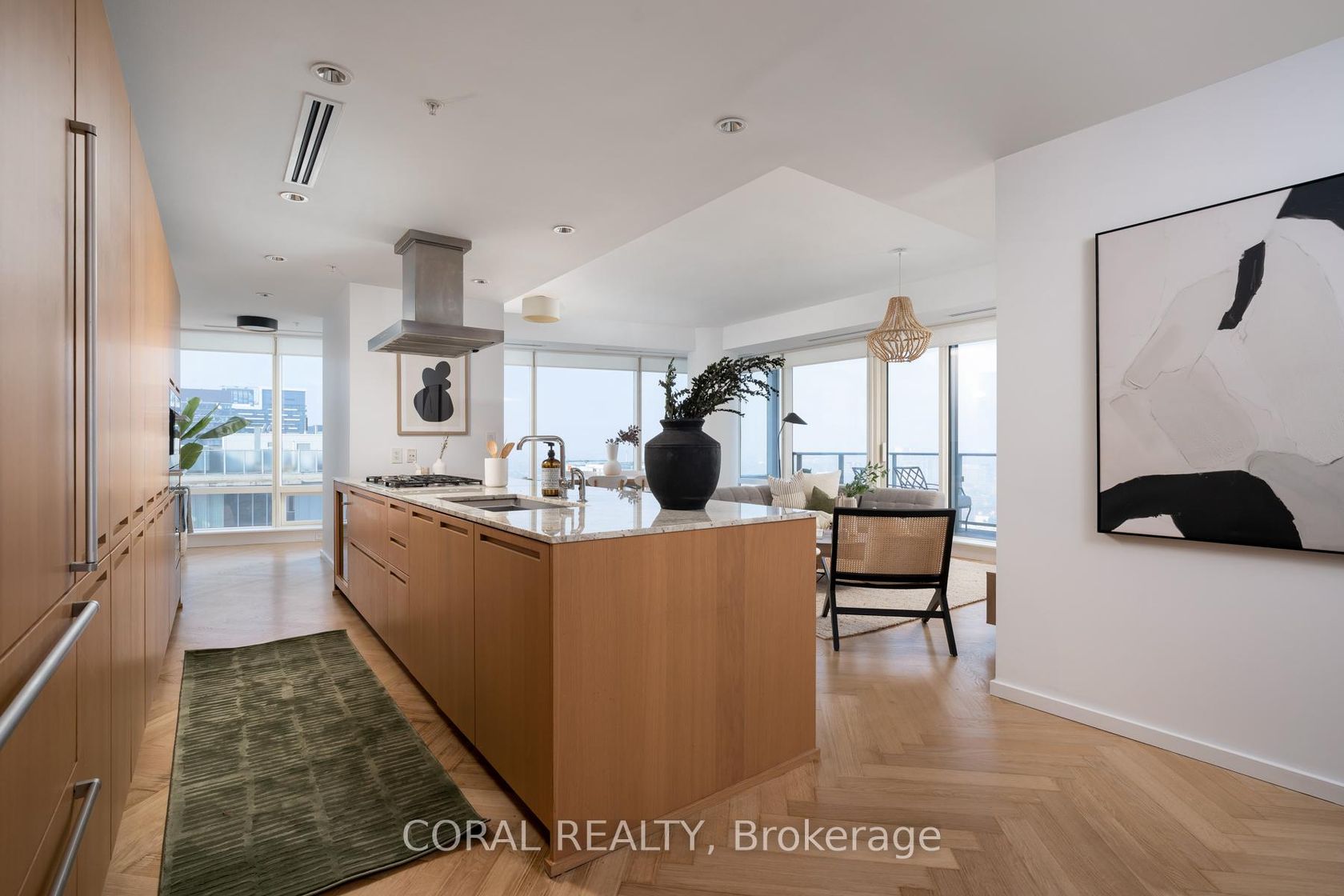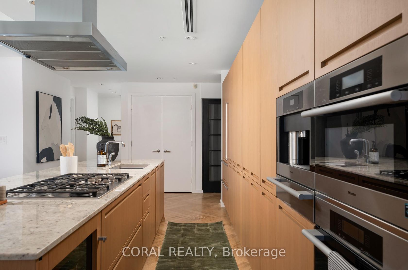 Experience elevated living in this beautifully appointed residence with sought-after NW exposure, offering abundant natural light and stunning sunset views. Freshly painted and professionally deep cleaned, this suite is truly move-in ready. Designed with refined taste, the home features elegant herringbone hardwood floors and a chef-inspired Boffi kitchen complete with an integrated Sub-Zero fridge, Miele built-in appliances, and a gas cooktop-perfect for both everyday living and entertaining. A sleek wine/beverage cooler adds an extra touch of sophistication. Unwind in luxurious Carrara marble-clad bathrooms and enjoy the convenience of custom walk-in closets in both bedrooms and hallway storage, along with a spacious walk-in closet in the primary suite. A dedicated laundry room provides added functionality and ease. Indulge in a hotel-inspired lifestyle with full-service amenities including a 24-hour concierge and doorman, spa access, and full access to the Miraj Hammam Spa (all on 5th floor). Wellness offerings include a 24-hour fitness center, yoga studio with scheduled classes, and a 20-metre indoor lap pool, hot tub, infrared sauna, and steam rooms. Enjoy in-building access to several high-end dining options, including The Lobby Lounge, Bosk Restaurant, and Mott32, along with hotel bar & lounge service and room service at your convenience.Complete with 1 parking space and 1 locker. Ace Carwash & detailing conveniently located in P1. A rare opportunity to own a sophisticated home that seamlessly blends luxury, comfort, and five-star living.
