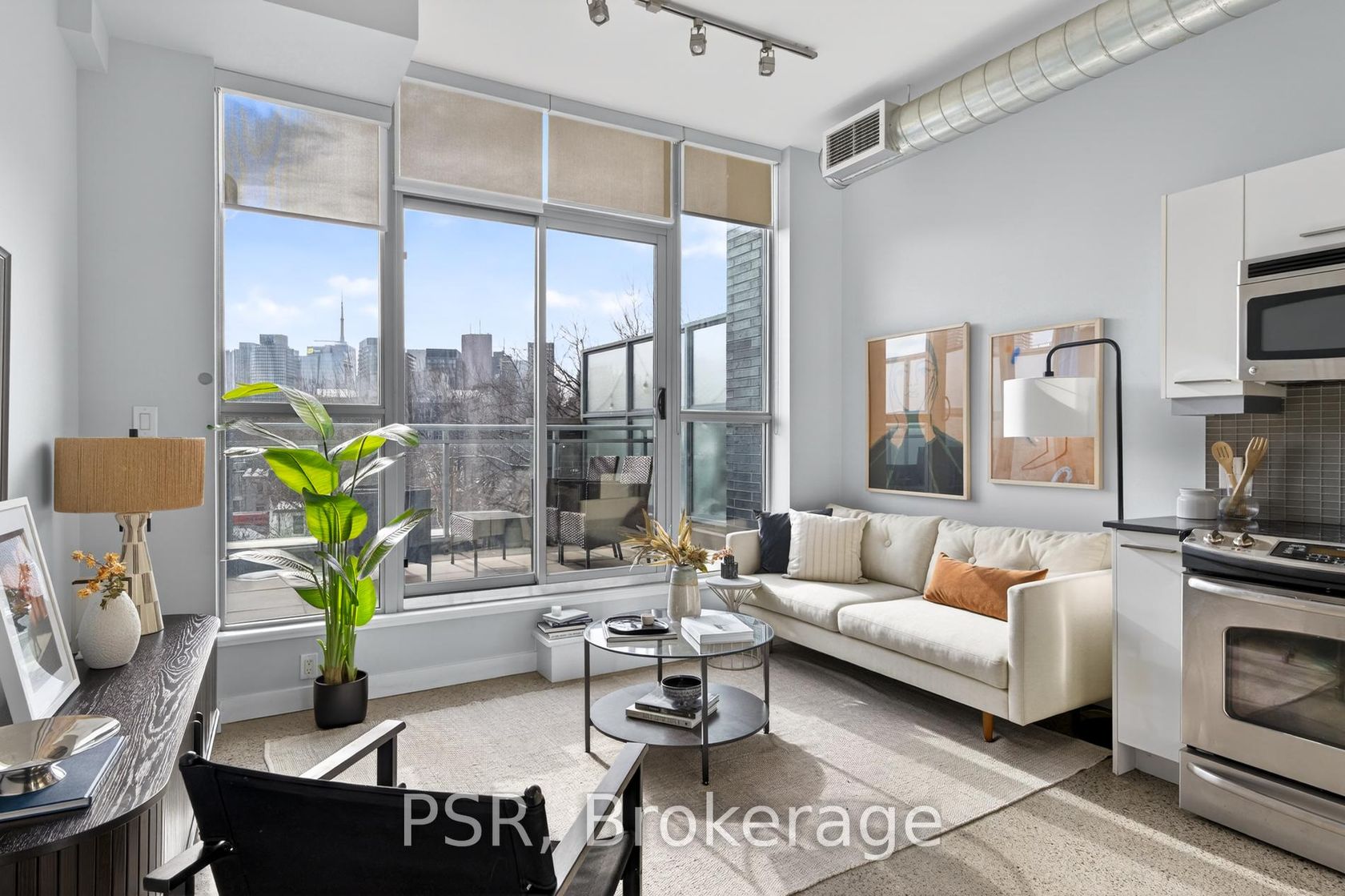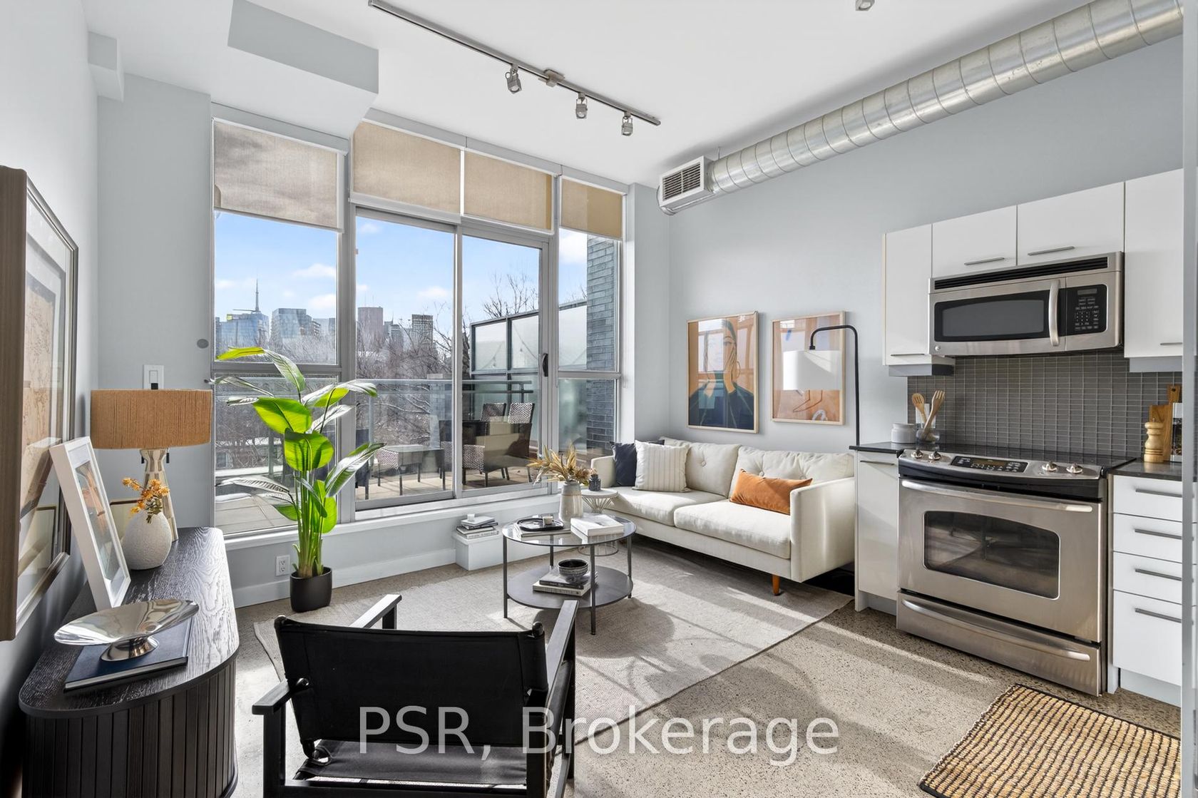 Modern loft living. Unbeatable location. Exceptional views. Welcome to stylish, urban living in the heart of Corktown! This stunning junior 1- bedroom loft offers the perfect blend of modern design and everyday functionality. Soaring ceilings and expansive west-facing windows flood the space with natural light and showcase breathtaking sunset views over the city. Step out onto your private terrace (complete with a gas hookup for BBQ) - an ideal spot for morning coffee, evening drinks, or simply unwinding while taking in the skyline. The sun-drenched kitchen is designed to impress, featuring mostly full-size stainless steel appliances, ample cabinetry, and plenty of prep space - perfect for cooking and entertaining. The open-concept layout maximizes every square foot, while the defined sleeping area offers comfort and privacy. This loft includes a 4-piece washroom, generous storage throughout, plus the convenience of a full-sized stacked washing machine and dryer. Building amenities include: gym, party room, rooftop terrace and meeting room! Commuting is a breeze, being close to several transit lines, and just minutes to the Don Valley Parkway (DVP). Enjoy being steps from some of the city's best shops, cafes, and restaurants!