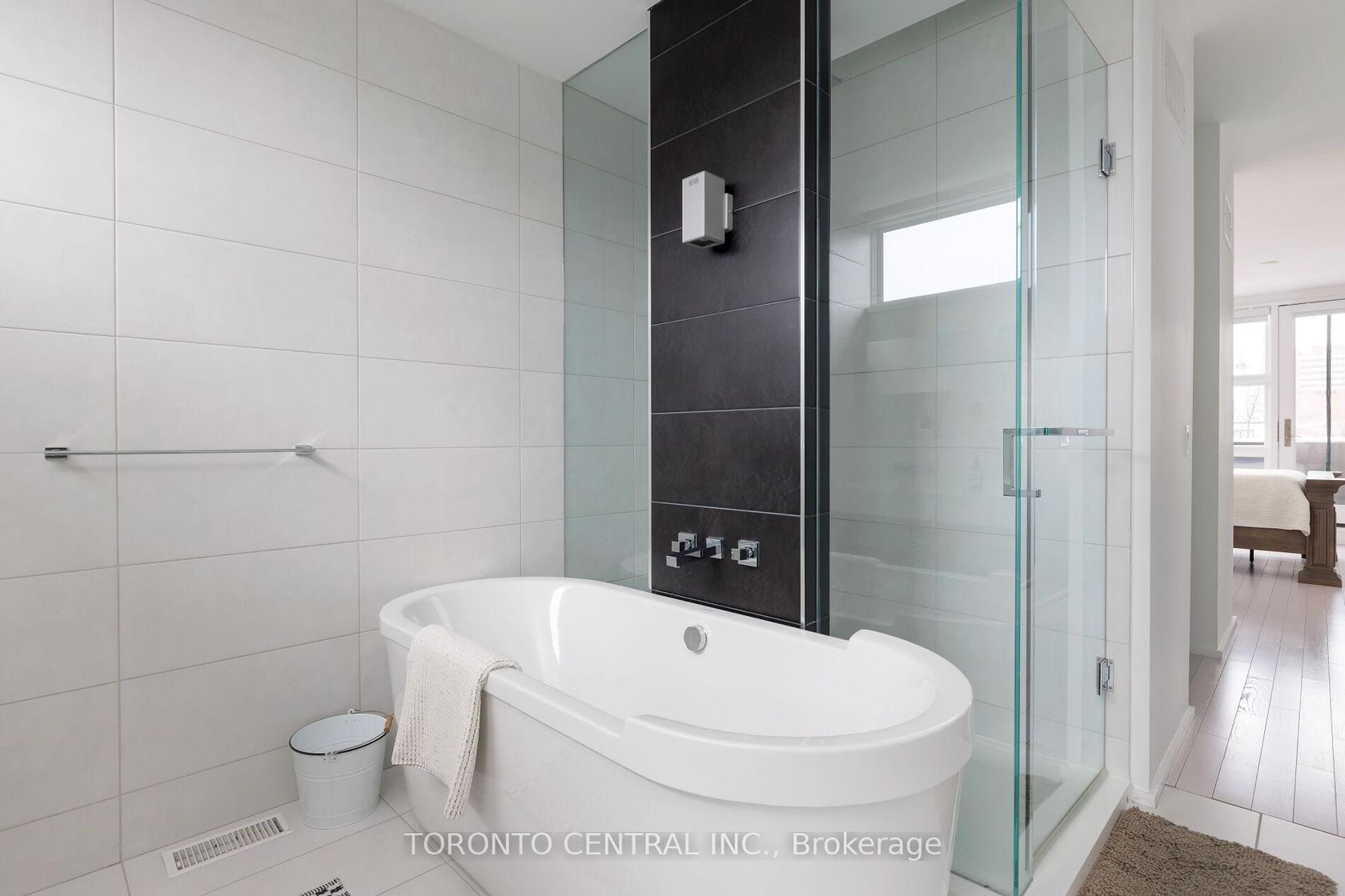 Welcome to 258 Manning Avenue, one of just 42 homes in the award-winning Trinity Towns development by Urban Capital & Shram Homes. Bright, east-facing with premium CN Tower views, this sleek modern townhome is positioned second from the end on the coveted Manning-facing side of the community-offering enhanced privacy and an exceptional streetscape presence. Thoughtfully designed with a highly efficient open-concept layout and no wasted space, the home is defined by lofty 10-foot ceilings and dramatic 10-foot glass walls that flood the main level with natural light throughout the day. Clean architectural lines frame a chef-inspired kitchen, generous dining area, and elegant living space that seamlessly connects to a massive private terrace with gas and water connections-perfect for effortless indoor-outdoor entertaining.Upstairs, three well-appointed bedrooms provide exceptional comfort and privacy. The full-floor primary retreat features a spacious walk-in closet with custom organizers, an additional wall-to-wall closet for abundant storage, and a spa-inspired ensuite complete with a designer soaker tub, oversized walk-in shower, and double vanity. Second-floor laundry adds everyday convenience. The lower level offers a versatile family room, den, or home office, a powder room, and direct access to a secure oversized underground garage equipped with an electric vehicle charger. Central vacuum adds another layer of modern comfort. A rare opportunity in an architecturally admired community, just moments to Trinity Bellwoods Park and the vibrant energy of College, Dundas West, and Queen West. Welcome home!