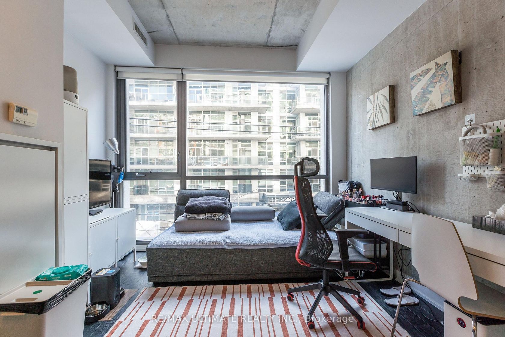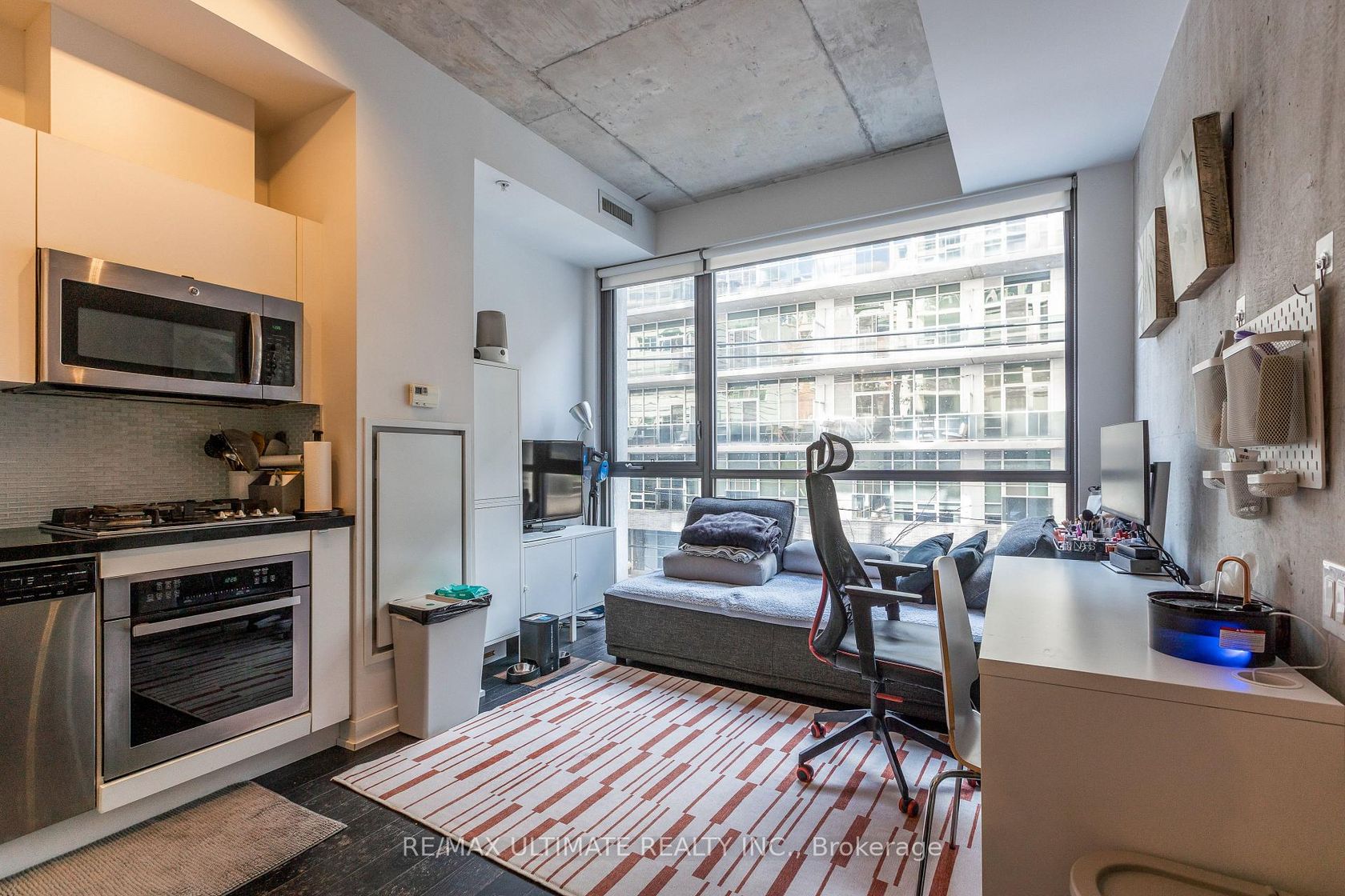 Fabulous "Home" on the "The Brant Park Lofts" in the heart of Vibrant King West Village-King West Neighborhood. This one-bedroom, with its modern design, makes it the perfect urban sanctuary. Bright, south-facing, open concept design with exposed concrete ceiling And Walls. Features 9 ft ceilings and large floor-to-ceiling windows. The kitchen boasts quartz countertops and a ceramic backsplash. Includes one locker. The boutique building offers 5-star amenities and enhanced security features, providing peace of mind for residents. Steps to all restaurants, cafés, fitness studios, nightlife, and close to the Financial District; directly across from Waterworks Food Hall & St. Andrews Park, with an off-leash dog area.