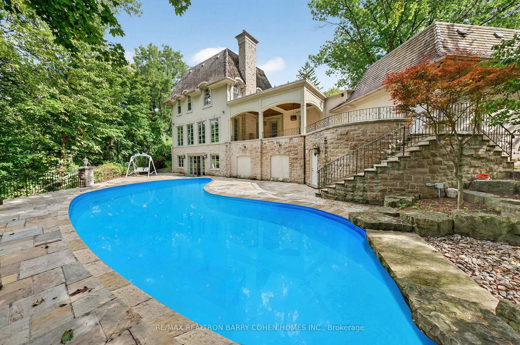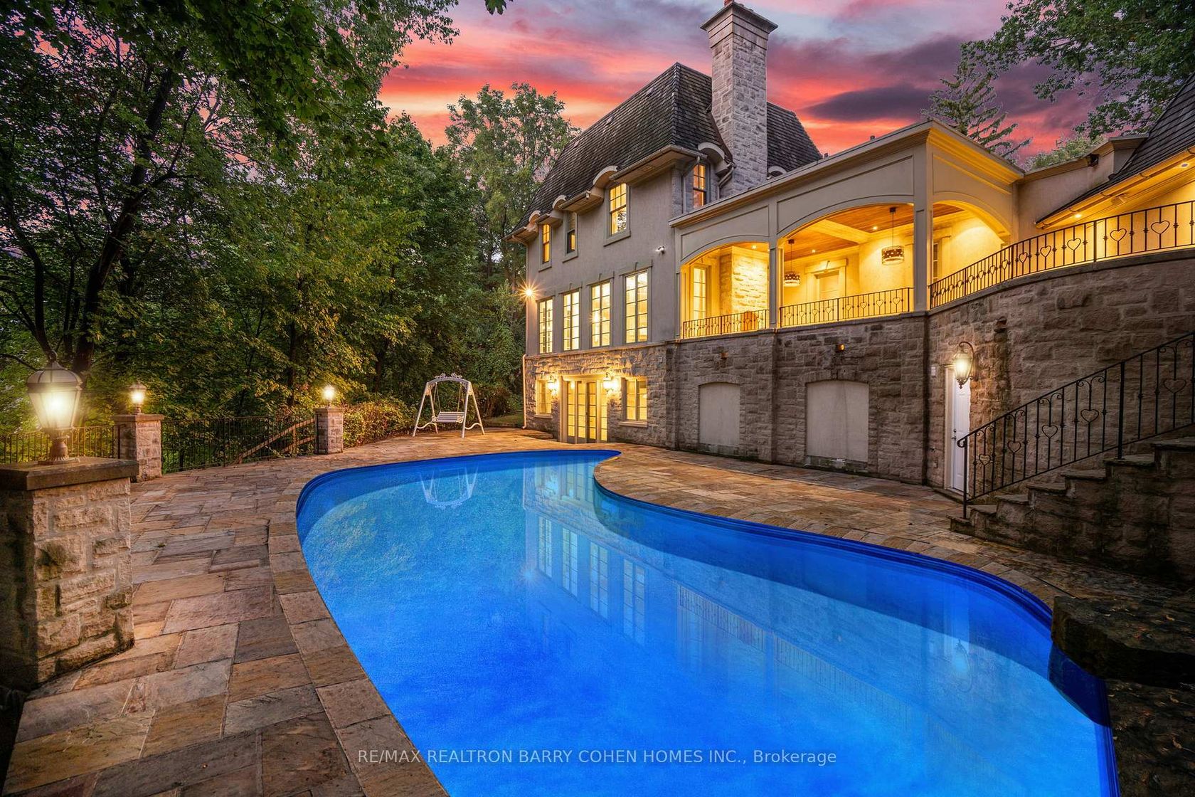 Backs Onto Ravine! Perched gracefully at the highest point of Hoggs Hollow, this French Château inspired masterpiece sits on a spectacular 239.08 x 207.81 ft ravine lot (approx. 1.14 acres). Designed by Dee Dee Taylor Hannah and built by award-winning builder Michael Rossini, this timeless stone estate offers over 10,000 sq.ft. of luxurious living space, blending European elegance with modern comfort. The homes distinctive curved and symmetrical design showcases architectural artistry rarely seen today. Featuring 4 bedrooms with ensuites, 9 washrooms, and a 3-car garage with a circular driveway accommodating up to 15 cars, all principal rooms face west, overlooking the serene ravine. A grand marble foyer, curved hallways, and custom millwork opens to elegant living and dining rooms that walk out to the ravine and garden. Two libraries on main floor, five fireplaces, built-in speakers, 10-ft ceilings, and hardwood floors throughout. The gourmet kitchen with double granite islands and an open-concept family room with motorized curtains creates a warm and inviting space for entertaining.Step out to a 700 sq.ft. patio with outdoor fireplace and panoramic ravine views. The primary suite features a lavish 9-piece ensuite, his & her walk-in closets, and heated bathroom floors. The walk-out lower level wth heated floors includes a home theatre, wine cellar, sauna, wet bar, nanny/guest ensuite, and a recreation room with fireplace opening directly to the backyard oasis.The heated concrete pool with cascading waterfall, framed by mature trees, creates a private, resort-like retreat. A rare offering combining elegance, privacy, and tranquility, just moments from the Granite Club, top private schools (Crescent, TFS, Havergal, UCC, BSS), fine dining, and Rosedale & Don Valley Golf Clubs.A true statement of taste, craftsmanship, and enduring luxury in one of Torontos most prestigious enclaves.