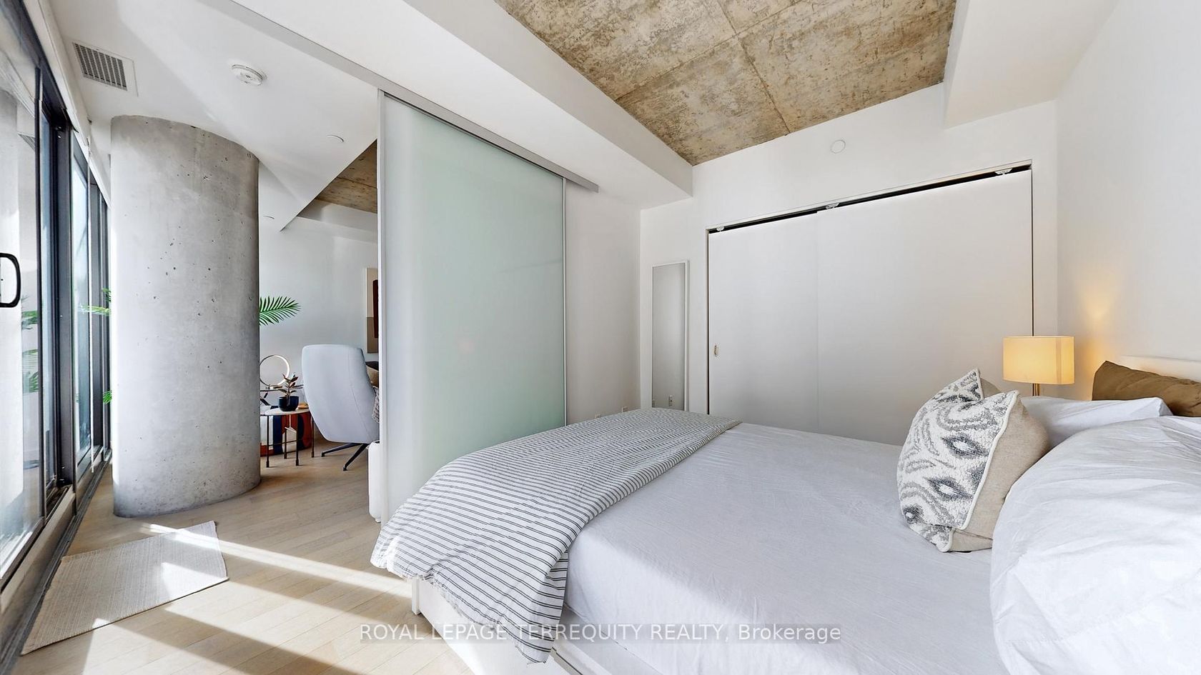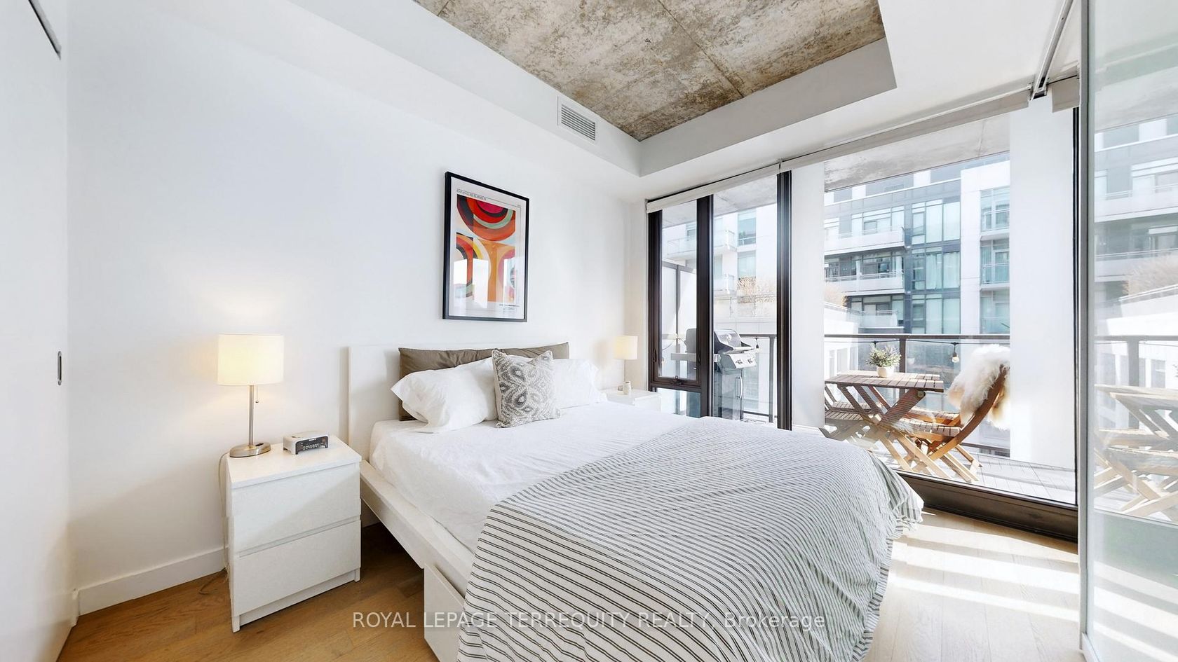 Welcome to OneEleven Condos, Suite 1313 - refined downtown living in the heart of King West. This boutique 1+1 bed residence blends raw architectural character with elevated design. Exposed 9ft concrete ceilings & floor-to-ceiling windows create a modern loft aesthetic, while the clean open-concept layout feels both inviting and sophisticated. The quiet east facing exposure overlooks open terrace space, offering bright, unobstructed views & soft morning light. Engineered hardwood floors ground the suite in warmth, complementing the understated luxury of the kitchen - featuring custom cabinetry, quartz countertops, sleek backsplash, integrated s/s appliances, breakfast bar & a gas range for elevated everyday cooking. Enjoy thoughtfully curated lighting throughout the suite. The spacious den is truly versatile, easily functioning as a second bedroom or private home office. Thoughtfully designed, the layout feels generous and highly functional throughout. Step outside to the extra-large outdoor space generously spanning the entire length of the suite - complete with a rare gas BBQ line. Whether it's morning coffee, a quiet read, or hosting friends in the evening, this terrace delivers effortless indoor-outdoor living. Enjoy the convenience of a dedicated parking space and extra-large private locker, both conveniently located along with one of the lowest maintenance fees in the city at just $541.55. Residents enjoy curated amenities including a rooftop terrace with BBQs, party room, guest suites, & concierge service. Perfectly positioned next to the future King-Bathurst station on the Ontario Line, this location is primed for continued growth. Walk to gyms, grocery, pharmacy, hardware stores and attractions like Stanley Park, St. Andrews Playground, Waterworks Foodhall, The Well, STACKT Market, & some of the city's best restaurants and cafés. Minutes to the waterfront along Lake Ontario with quick access to the Gardiner Expressway.
