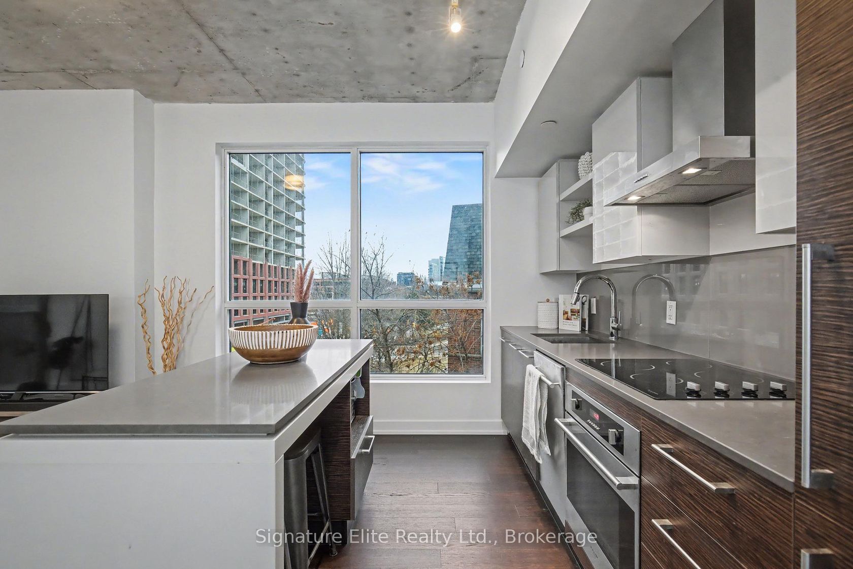 Urban Loft Living in the Heart of King West. This bright south-west corner suite at DNA3 captures the energy of downtown living with a modern loft feel and an abundance of natural light. Exposed 9-foot concrete ceilings and expansive windows create an open, airy atmosphere, giving the space a distinctive industrial-chic style that defines this sought-after building. The thoughtfully designed layout features two spacious bedrooms, including a primary suite with its own 3-piece ensuite, along with an open-concept living and dining area that walks out to a private balcony. The contemporary kitchen is anchored by a quartz centre island, providing the perfect space for casual dining, entertaining, or everyday living. Freshly painted interiors and quality finishes throughout enhance the suite's clean, modern aesthetic. Residents enjoy a full suite of amenities designed to complement an active urban lifestyle, including 24-hour concierge service, a fully equipped fitness centre, party and meeting spaces, and a rooftop terrace with BBQs. Step outside and experience the best of King West, with acclaimed restaurants, cafés, grocery stores, nightlife, and TTC transit just steps from your door. With strong rental demand and enduring neighbourhood appeal, this property offers excellent potential for both end users and investors seeking a vibrant downtown lifestyle.