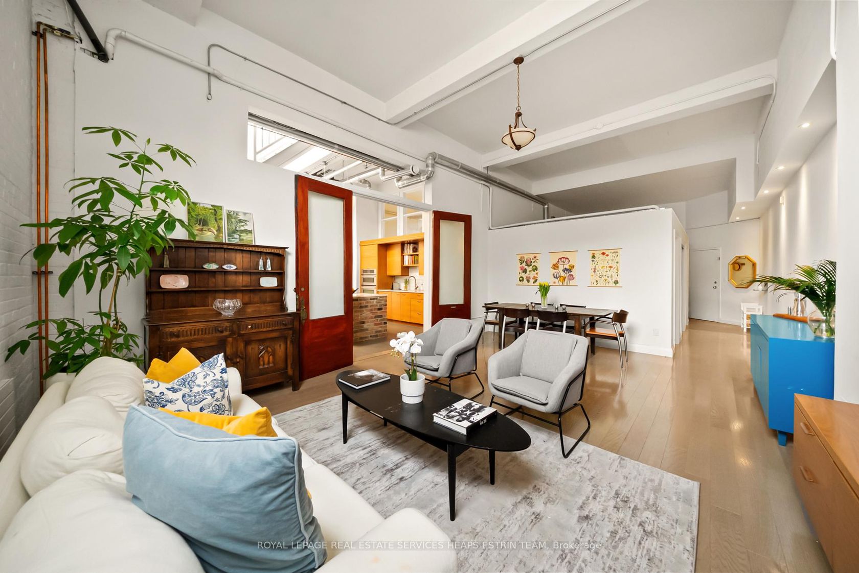 The Evening Telegram Lofts Authentic Loft Living Discover a rare opportunity to own a piece of Toronto's industrial heritage in the iconic Evening Telegram Lofts, a landmark conversion of the historic newspaper press building into authentic hard loft residences. This expansive live/work space masterfully blends vintage character with modern refinement across three thoughtfully designed levels, offering over 2,200 square feet of versatile living. Drenched in natural light from oversized windows and an enormous skylight, the unit feels bright, open, and inspiring throughout. Designed with flexibility in mind, this expansive loft can be fully adapted for private living, offering up to five sleeping areas and three bathrooms, anchored by a dramatic living and dining room with soaring 13-foot ceilings. Alternatively, as it is zoned for live/work use, the two smaller main-floor rooms can easily be converted into offices, creative studios, or client meeting spaces, offering an ideal setup for entrepreneurs or professionals seeking a dynamic home environment. Rich with historic character, this loft seamlessly incorporates elements of the original Evening Telegram building. The doors leading into the kitchen are repurposed from the original building entrances, and the striking kitchen island is anchored by brick footings that once supported the newspaper's mighty printing press a true homage to the past brought into contemporary living