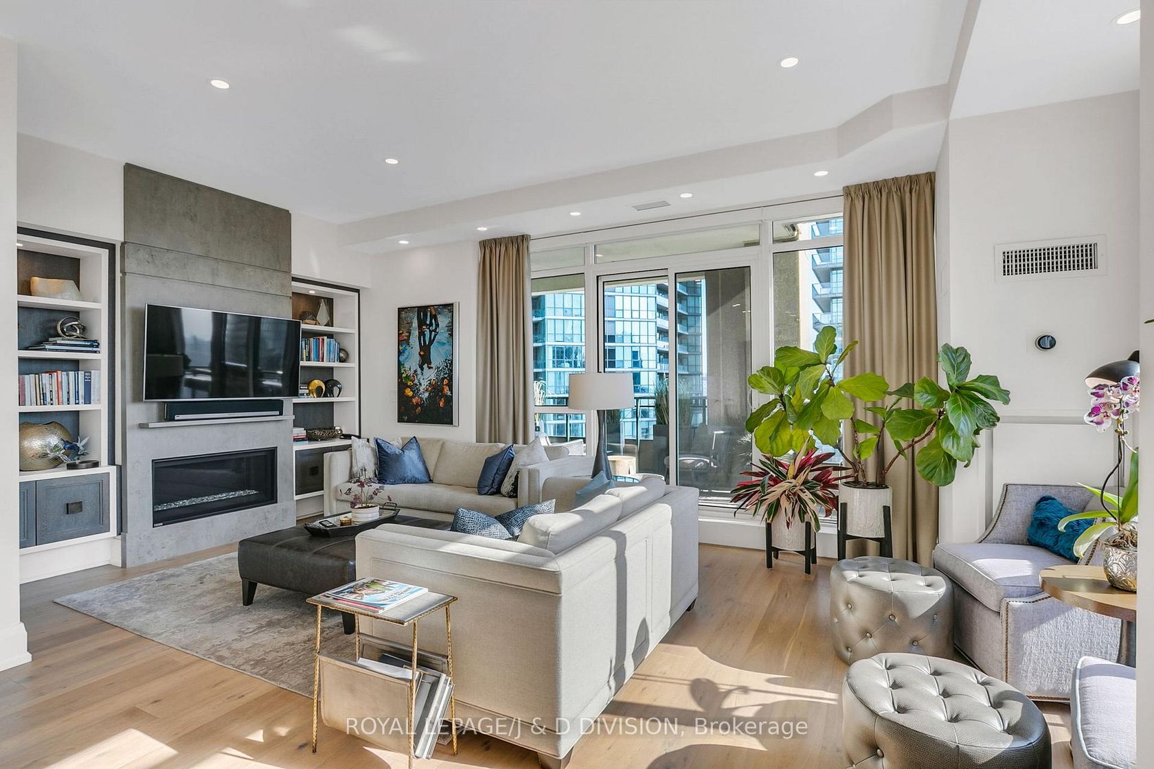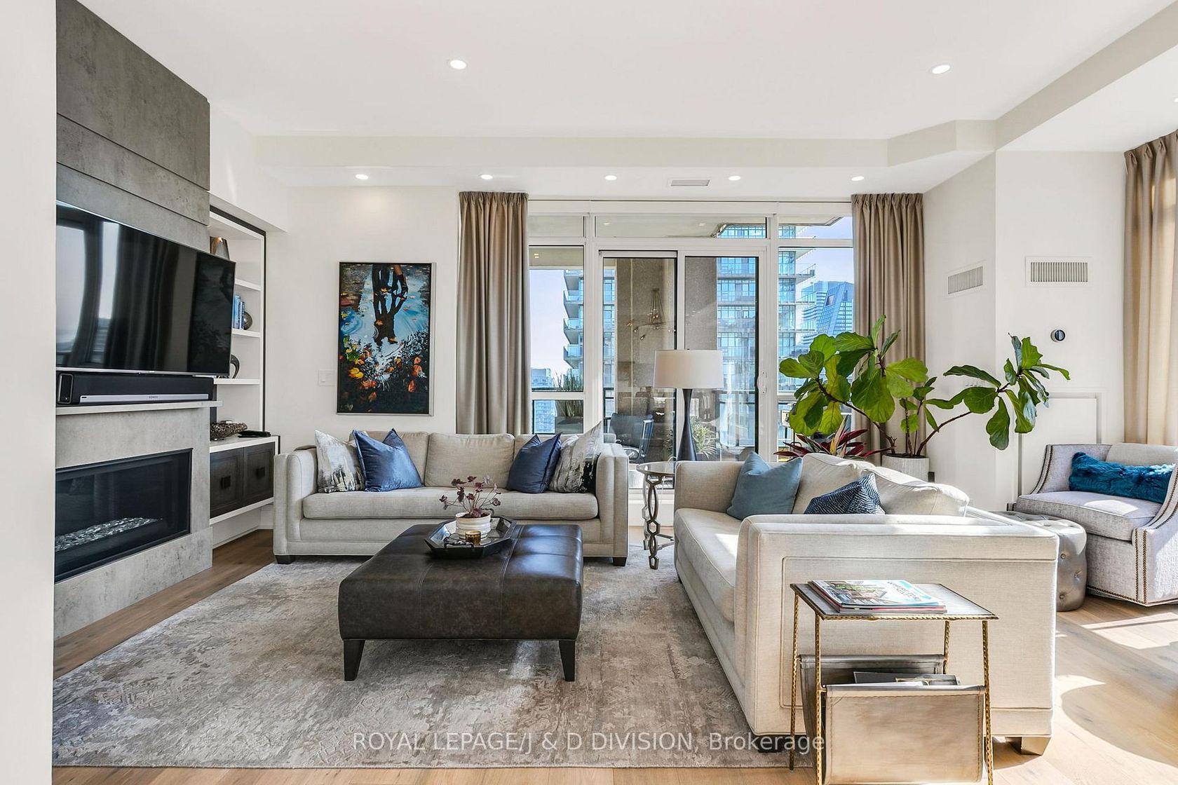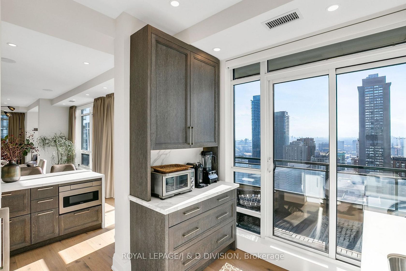 Experience the pinnacle of urban luxury in this expansive 1,954 sq. ft. sub-penthouse residence, offering a rare bungalow-in-the-sky lifestyle on the edge of prestigious Yorkville. Shared with only one other suite on the floor, this home spans the entire westerly side of the building, providing a front-row seat to stunning daily sunsets. Bathed in epic natural light from floor-to-ceiling windows and soaring 10-foot ceilings throughout, the interior is finished with stunning wide-plank white oak hardwood and elegant porcelain flooring.The heart of the home is an open-concept living and dining area anchored by a cozy gas fireplace, a custom porcelain-clad waterfall island, and a strategic pantry/bar area with a full-size wine fridge and abundant storage. The chef-inspired kitchen is a standout, featuring custom-designed cabinetry by the renowned Downsview Kitchens, premium appliances, and a gas range. Truly extraordinary for city living, this residence boasts five sets of patio doors leading to a spacious south-facing terrace and two west-facing balconies-totalling 371 sq. ft. of private outdoor space. The main terrace features a rare built-in gas line for BBQs, which are permitted. For added convenience, gas service for the BBQ, fireplace, and cooktop is included in the monthly maintenance fee.Unique to this home are two separate entrances: a formal main entry and a highly functional secondary mudroom with a custom built-in bench. The primary suite is a true retreat featuring a 5-piece spa-like ensuite, four closets, and private balcony access. Includes two-car parking and an owned locker. Residents enjoy premium amenities including a 24-hour concierge, exercise room, pool, a 17th-floor garden, and two available guest suites for visiting family and friends.This dog-friendly building welcomes pets of all shapes and sizes. Steps from the subway, Eataly, and world-class shopping, this is a rare opportunity for refined city living with flexible possession available.