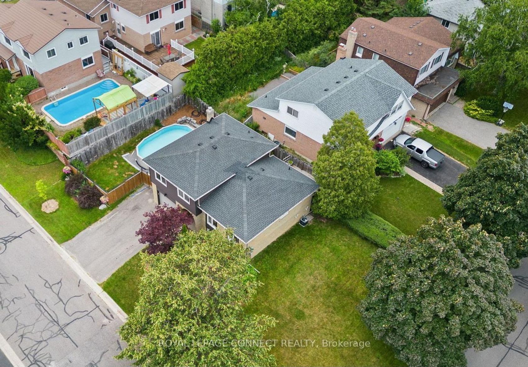Welcome to this stunning, move-in-ready family home, thoughtfully updated with modern finishes throughout. The sleek custom kitchen features high-end appliances, quartz countertops, a large centre island, black granite double sink, abundant cabinetry, and a walk-out to a brand-new deck. The open-concept layout flows seamlessly into the combined living and dining areas, ideal for entertaining. Three spacious bedrooms include a primary bedroom with an updated semi-ensuite. The second family room offers a walk-out to a private backyard oasis complete with an above-ground pool. The clean, unfinished basement includes laundry and ample storage, ready for your personal touch. Beautiful curb appeal with large, manicured corner lot and no sidewalks. Prime Whitby border location close to highways, top-rated schools, parks, and all amenities. Roof (17), Windows (18), Siding/insulation (18), Furnace (19), Tankless Water Heater (19),AC (22), Fence/deck 2025. Nothing to do but move in and enjoy.