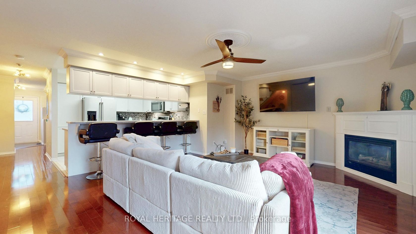 This outstanding executive townhouse with parking for 2 is ideally situated in the best block of Chateau By The Park. Built by Coughlan Homes & Spanning over 2,000 square feet across three generous floors plus a finished basement, the home features an open-concept main level with a formal dining room, a well-equipped kitchen and a family room complete with a gas fireplace. French doors open to a private west-facing deck, perfect for entertaining or unwinding. Upstairs, the second floor offers two large bedrooms-one with two walk-in closets & a four-piece bathroom, and a convenient laundry room. The entire third floor is dedicated to the luxurious primary bedroom suite, boasting a sitting area, a four-piece ensuite, his and hers closets, and a juliette balcony. The lower level provides a spacious recreation area, ample storage, a two-piece bathroom, and direct access to heated underground parking with two side-by-side spots at the door and an additional spot close by. Water tap for washing your car. Kitchen-Aid kitchen appliances are still under warranty, and recent upgrades include new two pc baths. Every level features a bathroom, and the property has very low annual heating and hydro costs. The complex is well maintained with all exterior maintenance-roof, doors, decks, tree replacement, and grass cutting-handled for you, supported by a large reserve fund for ongoing upkeep. Residents enjoy a range of amenities, including Rogers Xfinity cable, high-speed internet, water, parking, snow removal, landscaping, and exterior window maintenance included in the condo fees. The community offers a newly renovated party room for gatherings and a private mailroom for convenience, as well as abundant visitor parking and easy access to transportation and shopping, including quick entry to Highway 401. This well-appointed home presents a unique opportunity for spacious, comfortable, and maintenance-free living in a prime location. Be sure to click through the virtual tour.