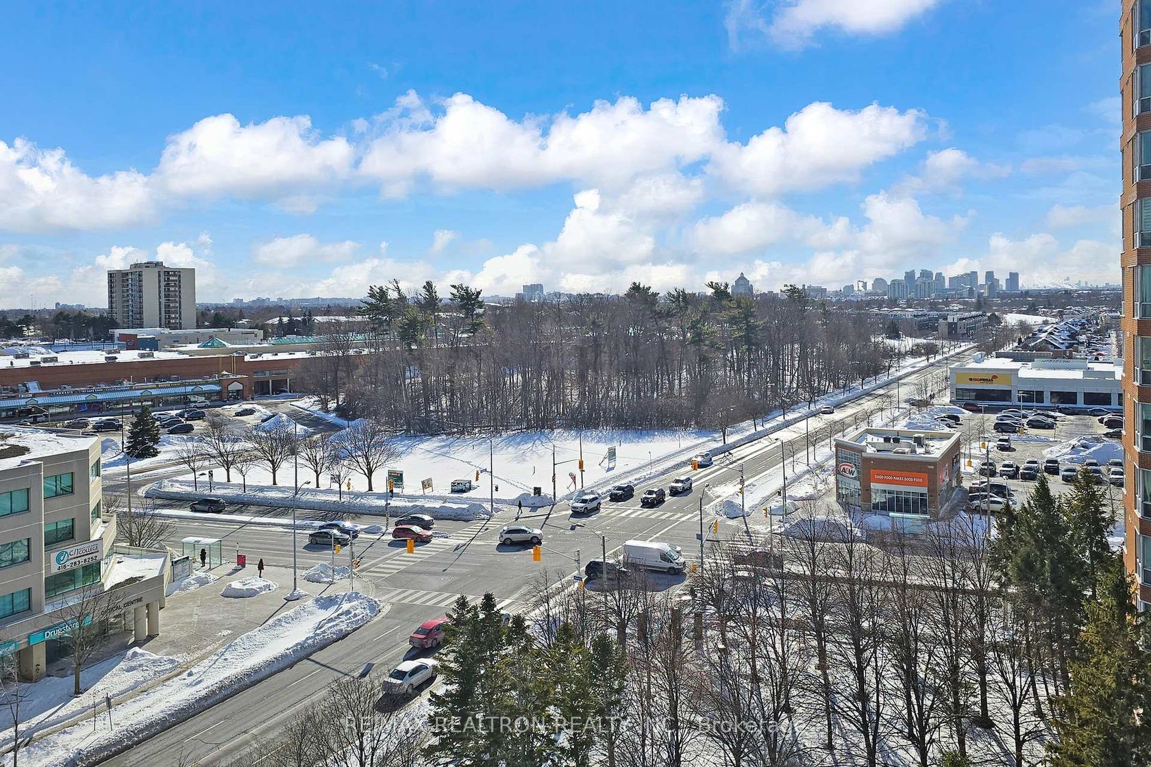 Welcome to this spacious, fully upgraded, sun-filled corner unit offering over 1,200 sq. ft. in the highly sought-after Mayfair on the Green community. Featuring a formal open-concept living and dining area with a walkout to an open corner balcony, this home showcases spectacular panoramic, unobstructed views. The den has been converted into a bright eat-in breakfast area. The spacious primary bedroom offers his & hers walk-in closets and a 4-piece en-suite. Enjoy engineered hardwood flooring, granite kitchen countertops with IKEA cabinetry in the kitchen and bathrooms, and California shutters throughout. Located in a desirable neighborhood with exceptional amenities, including a gym, indoor pool, squash and tennis courts, party room, and 24-hour gated security Walking distance to medical buildings, shopping mall, Shoppers Drug Mart, No Frills, library, elementary, and high schools. TTC at your door and minutes to Highway 401.Move in and enjoy!
