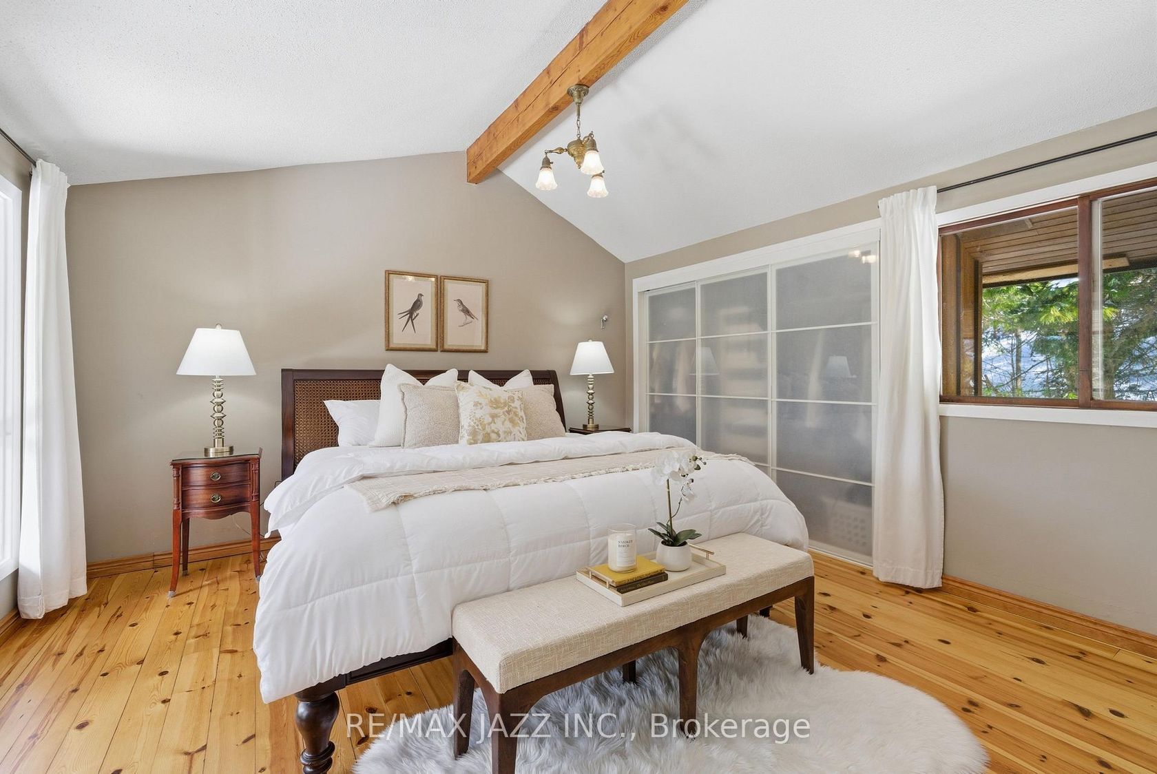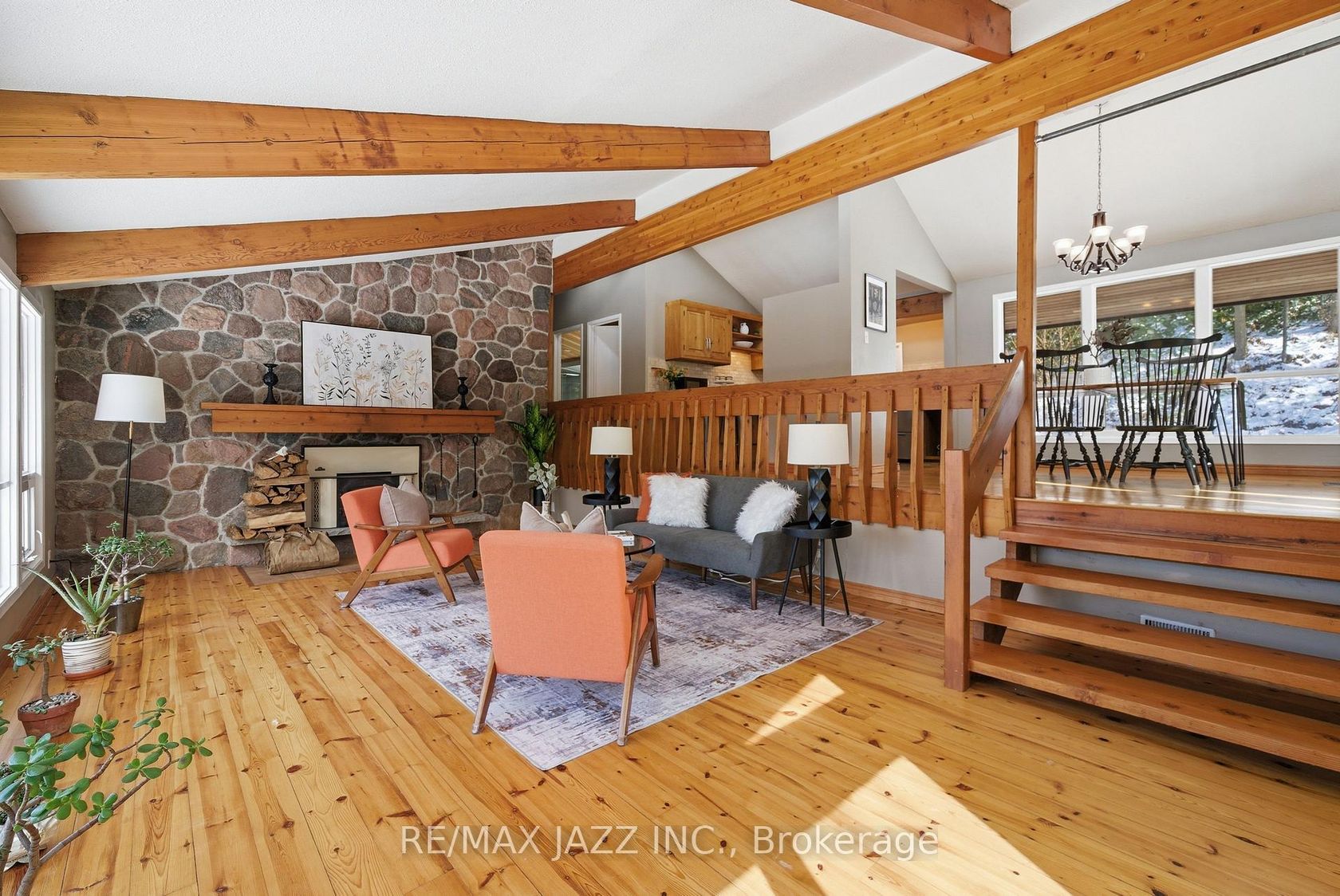 Situated on 40 private acres, this sun-filled home overlooks two beautiful spring-fed ponds and offers the perfect blend of privacy, nature, and functionality. Vaulted ceilings and red pine floors run throughout the main living space, while the updated kitchen overlooks a stunning sunken living room anchored by a wood beams, a stone wall and a wood-burning fireplace. A walk in pantry offers additional storage. The home features three spacious bedrooms, including a primary retreat with vaulted ceilings and a walkout to a private balcony - the perfect place to enjoy peaceful views of the property. The lower level adds incredible versatility and a resort setting with exposed brick, timber beams, an electric fireplace, and a dry sauna with soaker tub. Two separate driveways provide convenient access - one to the main level and another to the lower living area. A standout feature of the property is the separate 40 x 60 ft shop with 200amp service, a drilled well, kitchenette and its own private driveway and separate address - perfect for hobbyists, contractors, or anyone looking for dedicated workspace. Surrounded by mature trees and natural beauty, this stunning property is a true private oasis - ideal for those seeking space, tranquility, and a shop-ready lifestyle. This home is also on the managed forestry program offering reduced property taxes!