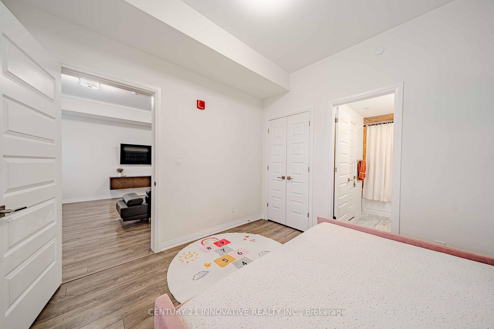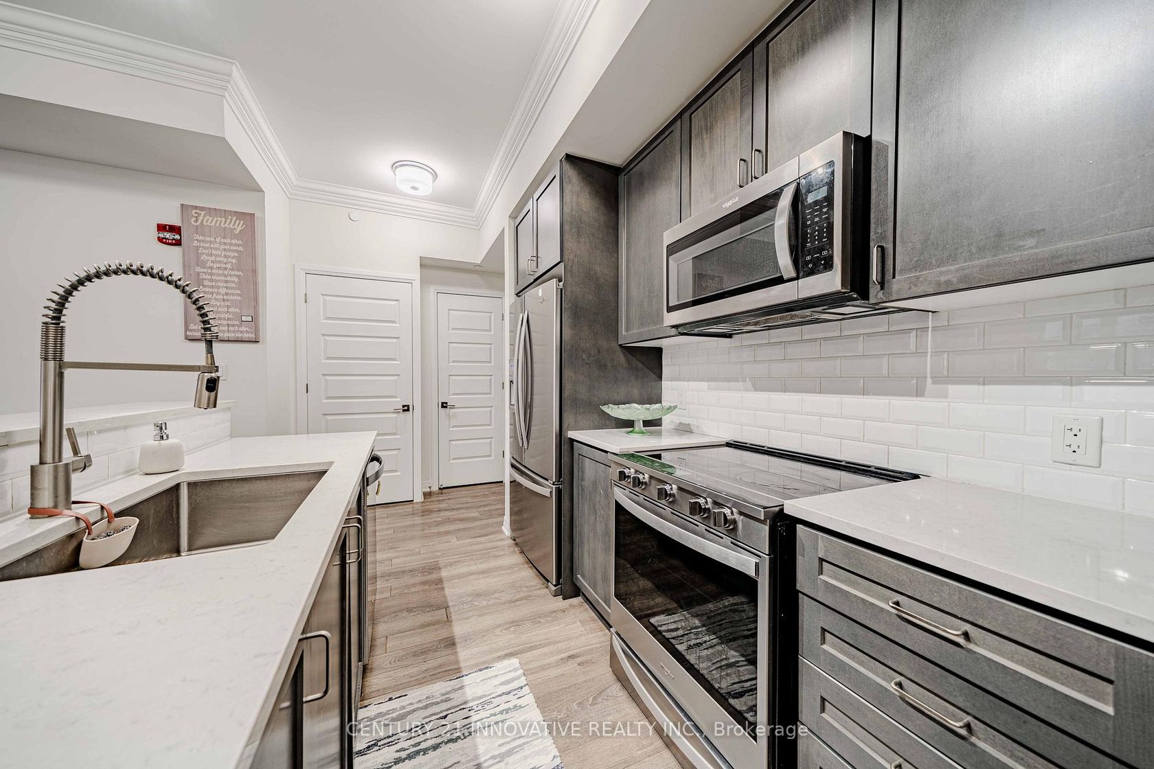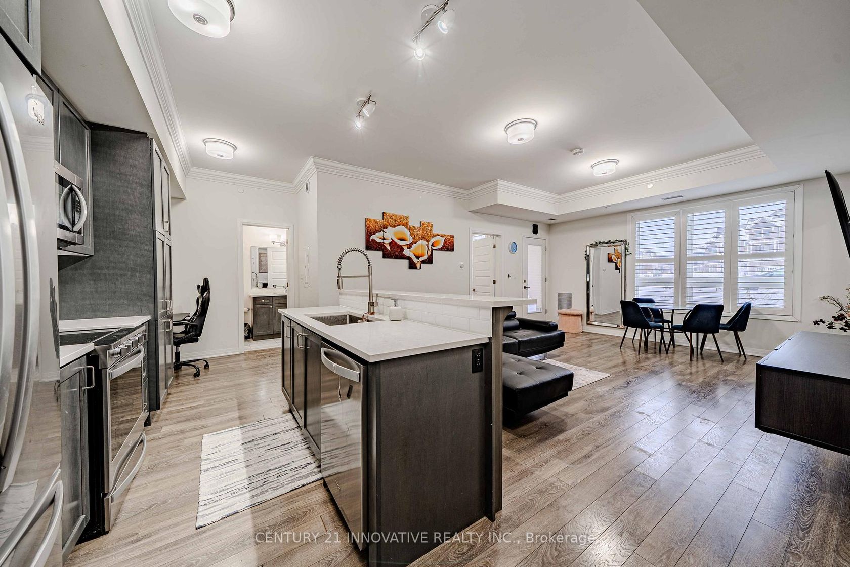 Welcome to the crown jewel of Markham in the highly sought-after community of Cornell, offering this beautifully upgraded 2-bedroom + den, 2 full bathroom home with a stunning open-concept layout designed for modern living. Enjoy a private walkout patio with convenient access to visitor parking, perfect for everyday ease and entertaining. With over $50k in upgrades, this immaculate unit features laminate flooring throughout, smooth 10-foot ceilings with elegant 7" crown moulding, and large windows that flood the space with natural light. The designer kitchen showcases quartz countertops, a large island, ceramic backsplash, single undermount sink, and an oversized custom builder pantry, while the upgraded bathrooms provide spa-like finishes including quartz countertops, raised vanities with extra storage, glass walk-in shower with full-height tile and pot lighting, high-efficiency dual flush toilets, premium fixtures, and large-format stone floor tiles. Additional highlights include a spacious primary bedroom with walk-in closet, custom fitted double-door closet in the second bedroom, California shutters throughout, full-size stainless steel laundry with steamer feature, high-efficiency water heater, and internet included in condo fees. Residents enjoy excellent building amenities including a party room with pool table, fully equipped fitness centre, and rooftop BBQ patio. Includes 1 parking space and 1 locker, all appliances, electrical light fixtures, and window coverings, and is ideally located close to transit, schools, community centre, library, hospital, and parks, offering the perfect blend of comfort, convenience, and upscale community living.