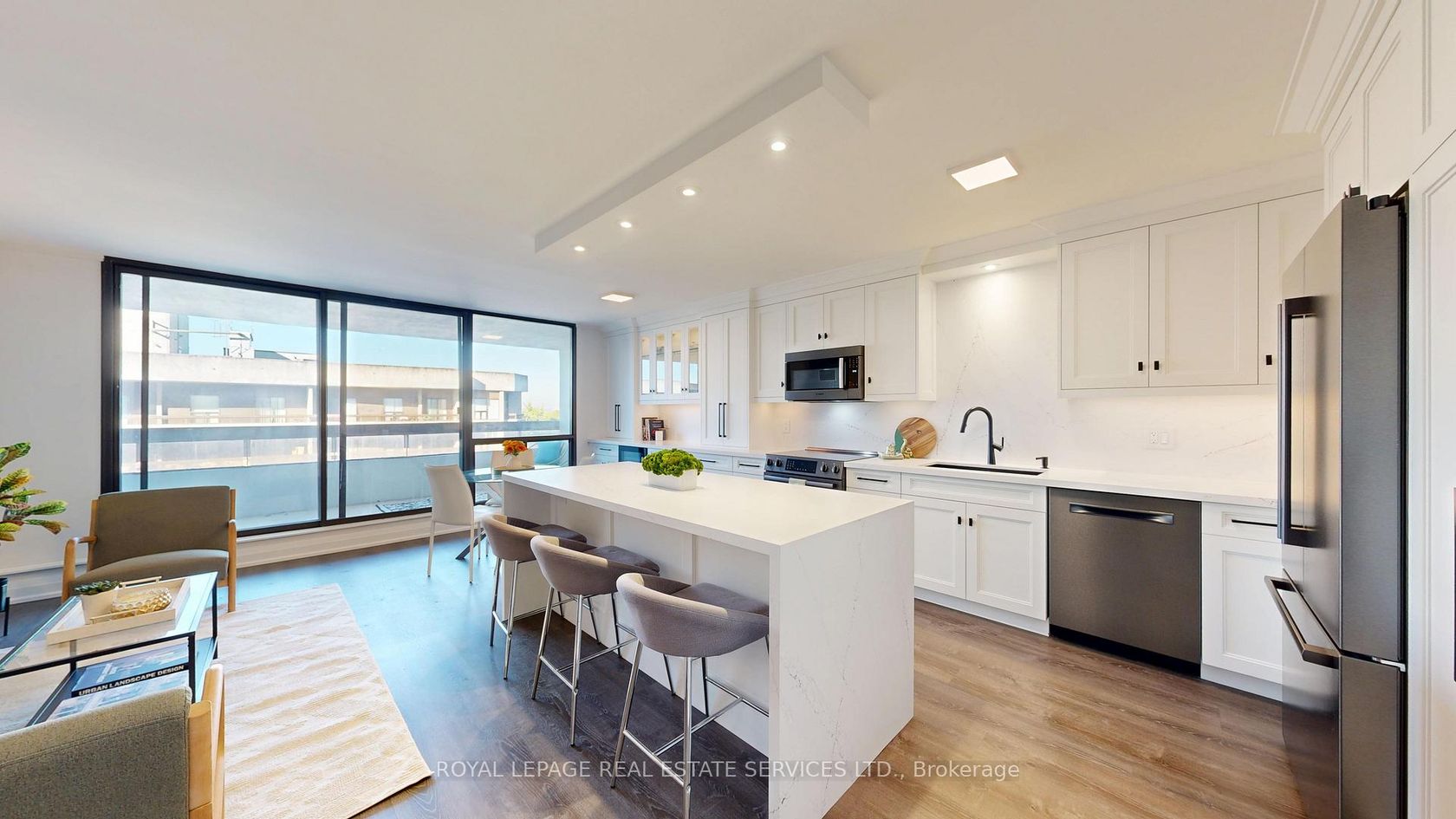 #804 at 100 Quebec Ave is a gorgeous, sun-filled unit that has maximized the square footage during renovations by redesigning the Living area. Renovations include a large, Suede finish, Quartz Island and Counters that are complimented by the Brushed Black Steel Bosch appliances and Bar Fridge. The Custom Kitchen Cupboards and drawers blend beauty with functionality for everyday convenience. The large Primary Bedroom has a spacious walk thru closet and stylish ensuite bathroom while the Second Bedroom is roomy and sports a double closet. The Laundry room boasts efficient front loading washer and dryer and the main Bathroom is adorned with hand crafted Porcelain surrounds and matte black hardware. There is a large open balcony with wall-to-wall sliding glass doors that flood the home with natural light. 804 includes one locker and one underground parking spot. The maintenance fee includes all the utilities and amenities. Play or watch tennis, workout in the gym or enjoy a swim in the outdoor pool. The amenities also include a party room and visitor parking. 100 Quebec is a coveted and popular location situated just steps from the subway, High Park and the renowned shops and cafes of Bloor West Village. Be our guest and enjoy a private showing.