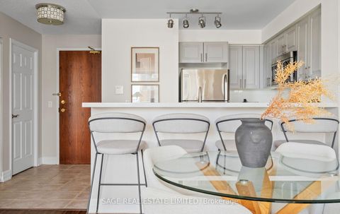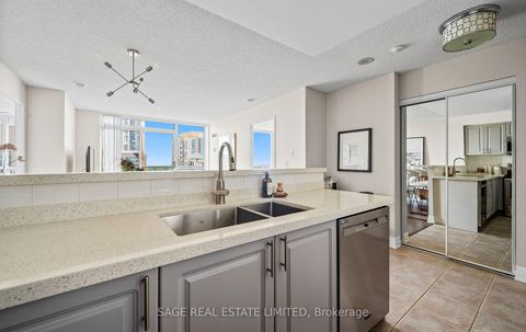 Experience Penthouse Perfection on Michael Power Place. Soak up the sun and views from this spectacular south-facing 2-bedroom, 2-bathroom corner penthouse - a rare 815 sqft suite offering privacy, wall-to-wall, floor-to-ceiling light, and even a peek at Lake Ontario. This particular open-concept layout easily accommodates a full-sized TV and dining area, while the peninsula in the updated kitchen serves as a convenient breakfast bar for casual meals or entertaining. Designed for privacy, the split-bedroom layout features a primary suite with a 3-piece ensuite, a notably spacious second bedroom, and ample closet space throughout. Upgrades include new bathroom vanities, dishwasher (2023), washer/dryer (2021), HVAC remediation, light fixtures, and painted kitchen cabinets. Located steps from Michael Power Park, Islington and Kipling stations with TTC, GO and MiWay access, as well as many nearby shops and cafes - this is your penthouse opportunity in the heart of Etobicoke. This impeccably maintained unit also includes one of the most convenient parking spots in the building, located on the first level in close proximity to the elevator, and a locker on the same level, simplifying your daily errands. With all-inclusive maintenance fees in a well-managed building, all that's left to do is move right in!