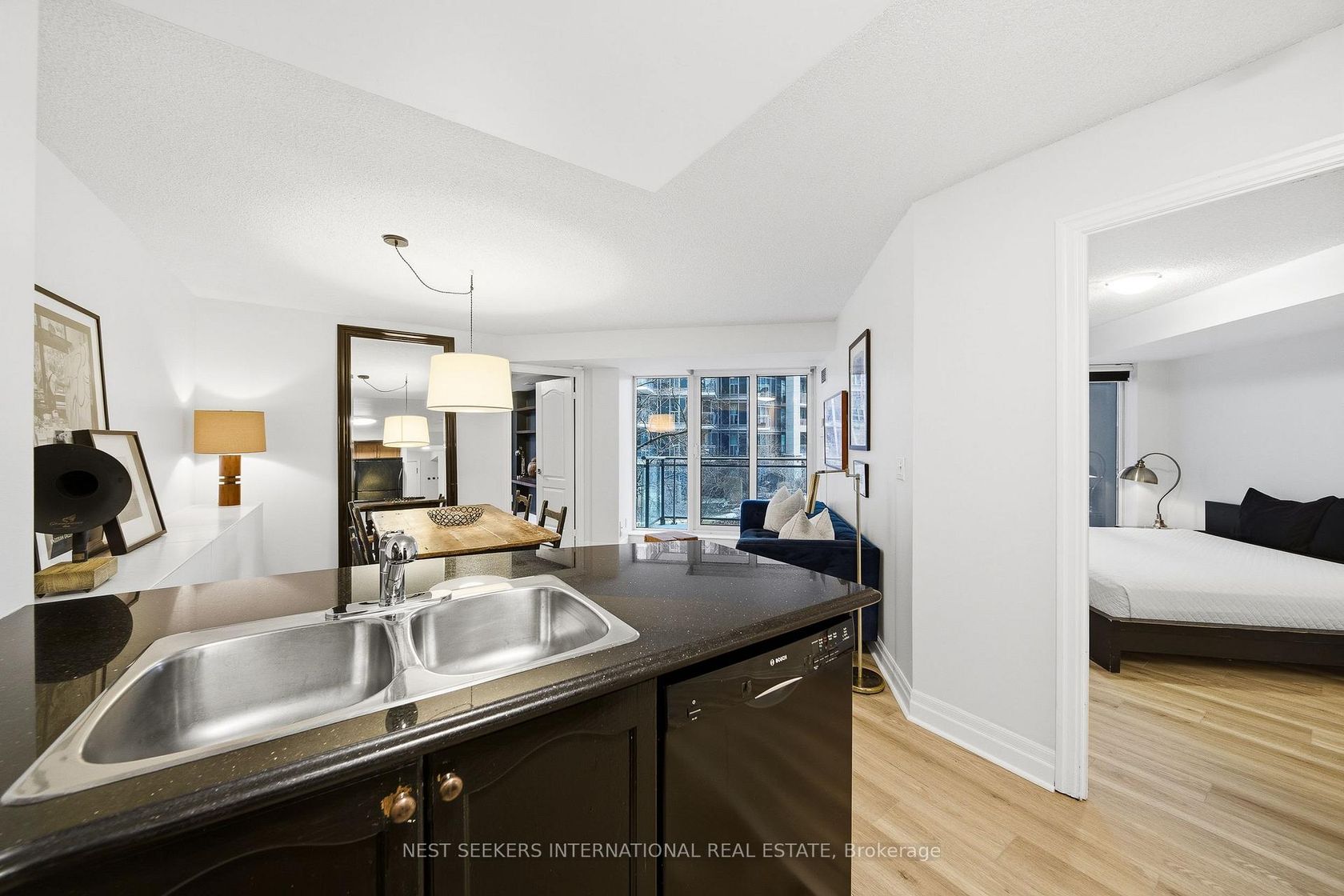 Welcome to Voyageur Waterview Condos. Experience elevated condo living in this bright, southeast-facing unit ideally located in Toronto's vibrant west end. Just minutes from downtown and steps to the lake, waterfront trails, and TTC, this 800 sq. ft. residence offers exceptional comfort and convenience. The functional layout features large bedrooms, an open-concept living and dining area, and two garden-facing balconies with three walkouts, perfect for seamless indoor-outdoor living. Floor-to-ceiling windows flood the space with natural light, while brand new flooring throughout adds a fresh, modern feel.The full kitchen includes built-in appliances and a breakfast bar, ideal for both everyday living and entertaining. An ideal split-bedroom layout provides added privacy, complemented by ensuite laundry and parking included. Enjoy close proximity to shops, restaurants, parks, trails, major highways, and everyday amenities, all within a highly sought-after waterfront community. An exceptional opportunity to enjoy lakefront living with urban convenience.
