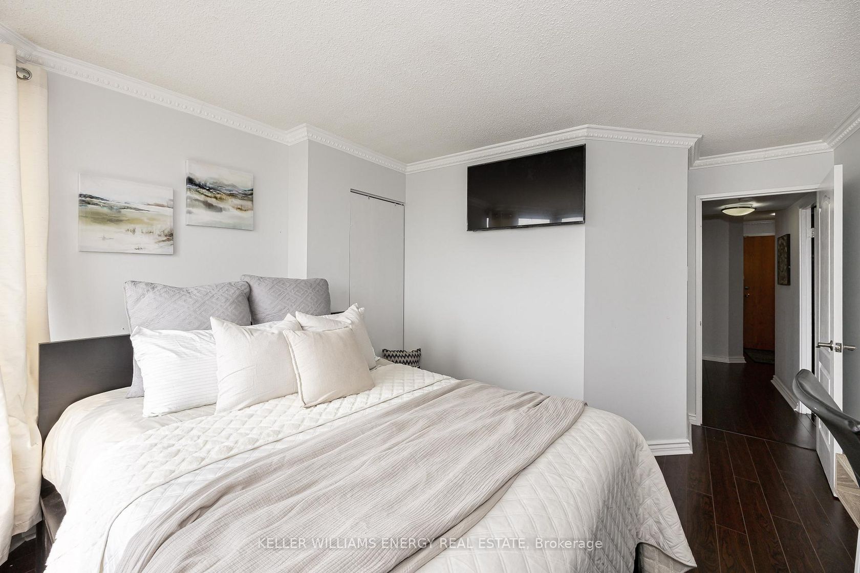 2 Bedroom, 2 Bath High Level, South Facing END UNIT. No Neighbours on the North Side. This Unit offers breathtaking views of the Humber River Trail and the City Skyline, even the CN Tower on Clear days. This unit has been well maintained and updated. Just under 1000 sq ft of living space. Open concept living and dining area. Kitchen complete with Stainless Steel Appliances, recently added counter space with a modern coffee nook with smoke glass cabinets and additional storage. Just off the kitchen is the bright dining area with large windows from floor to ceiling. This area can also be used for an office area. The primary bedroom features a wall-to-wall triple door closet, a private 4 piece ensuite bathroom with marble floors, granite countertop, and an ensuite laundry for added convenience. The second bedroom is also generously sized with a closet and large windows. 2nd bathroom is a 3-piece, equipped with a walk-in shower, vinyl floor, and free-standing vanity. 2 bedrooms, 2 full bathrooms, ensuite laundry, in- unit storage/ utility room, large hall closet, freshly painted throughout, crown moulding, and so much more is what sets this unit apart from the rest. Additonal Highlights include low property taxes, low maintenance fees, and low utility costs. Pets are welcome with restrictions. 1 Owned Parking space, 1 Owned locker. Set in a quiet, well-maintained building with no north-side neighbors, residents enjoy a full suite of amenities: indoor pool, fitness centre, sauna, recreation/party room, visitor parking, and 24-hour security, stepts away from North Humber Park with a large baseball diamond, splash pad, large Park and basket ball court. So much fun for the family and great for picnics. Conveniently located minutes from TTC, Highways 427 & 401, Pearson Airport, and close to York University, Humber College, top-rated schools, shopping, and scenic nature trails.